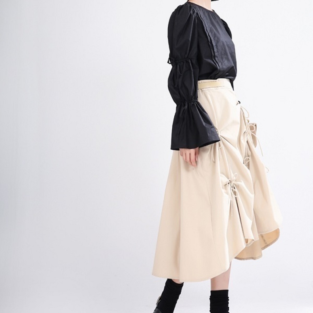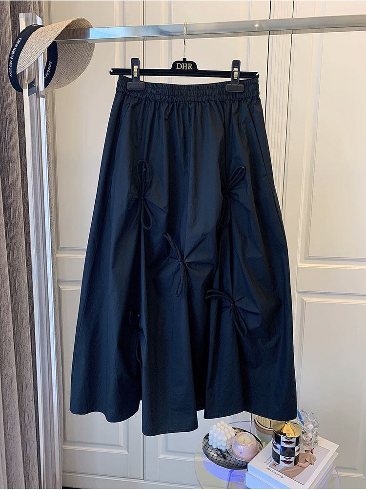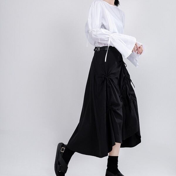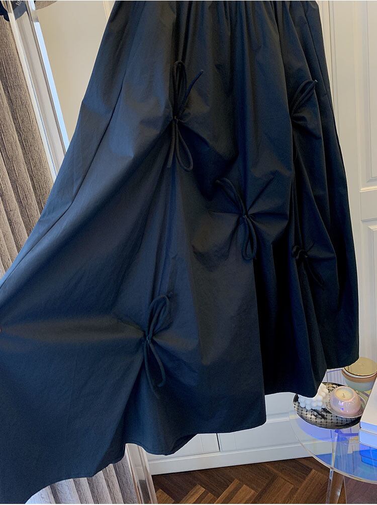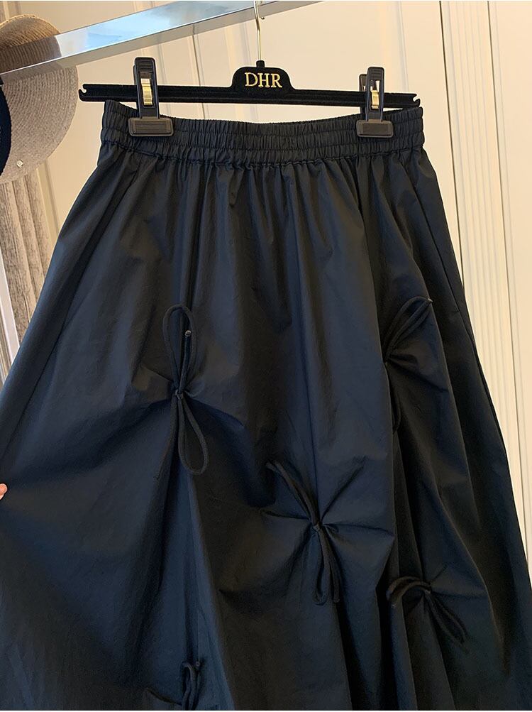 スカート ボトムス ミモレ丈 フレア リボン スカート ギャザー ウエストゴム ポケット付き ボリューム モード ハイウエスト ワイド ゆったり ストレッチ 韓国 かわいい 可愛い リラックス きれいめ 楽ちん 春 スプリング 冬 ウィンター ストリート カジュアル レディースこなれ感 着回し クラシカル 上品 女性用 高校生 30代 40代 低身長 ゆったり ゆる 黒 ブラック