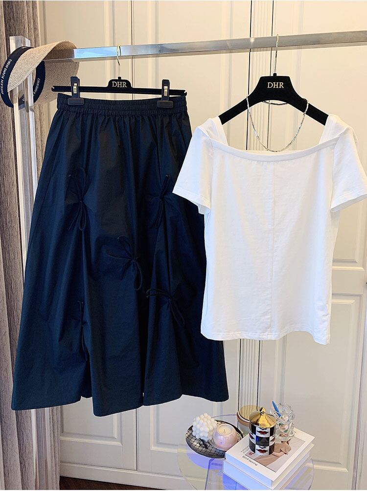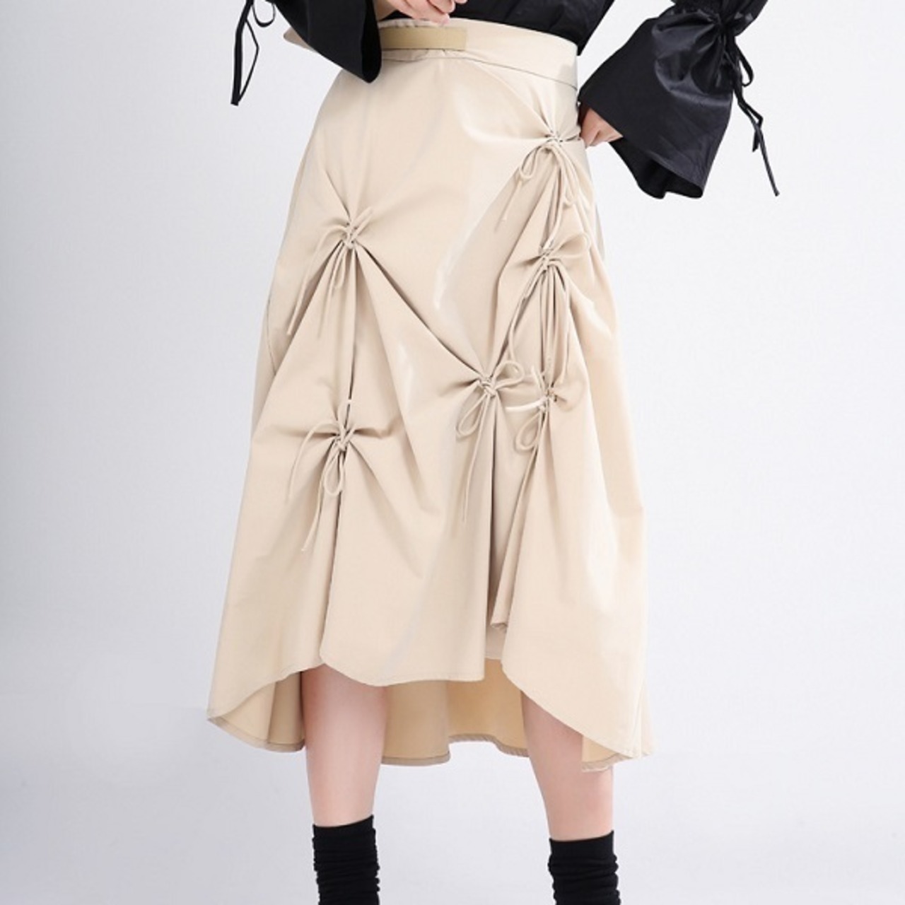ギャザーを寄せてリボンを留めた個性的なフレアスカートです。