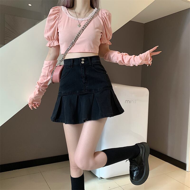 自然なAラインシルエットなのでクロップトップとの相性抜群です。