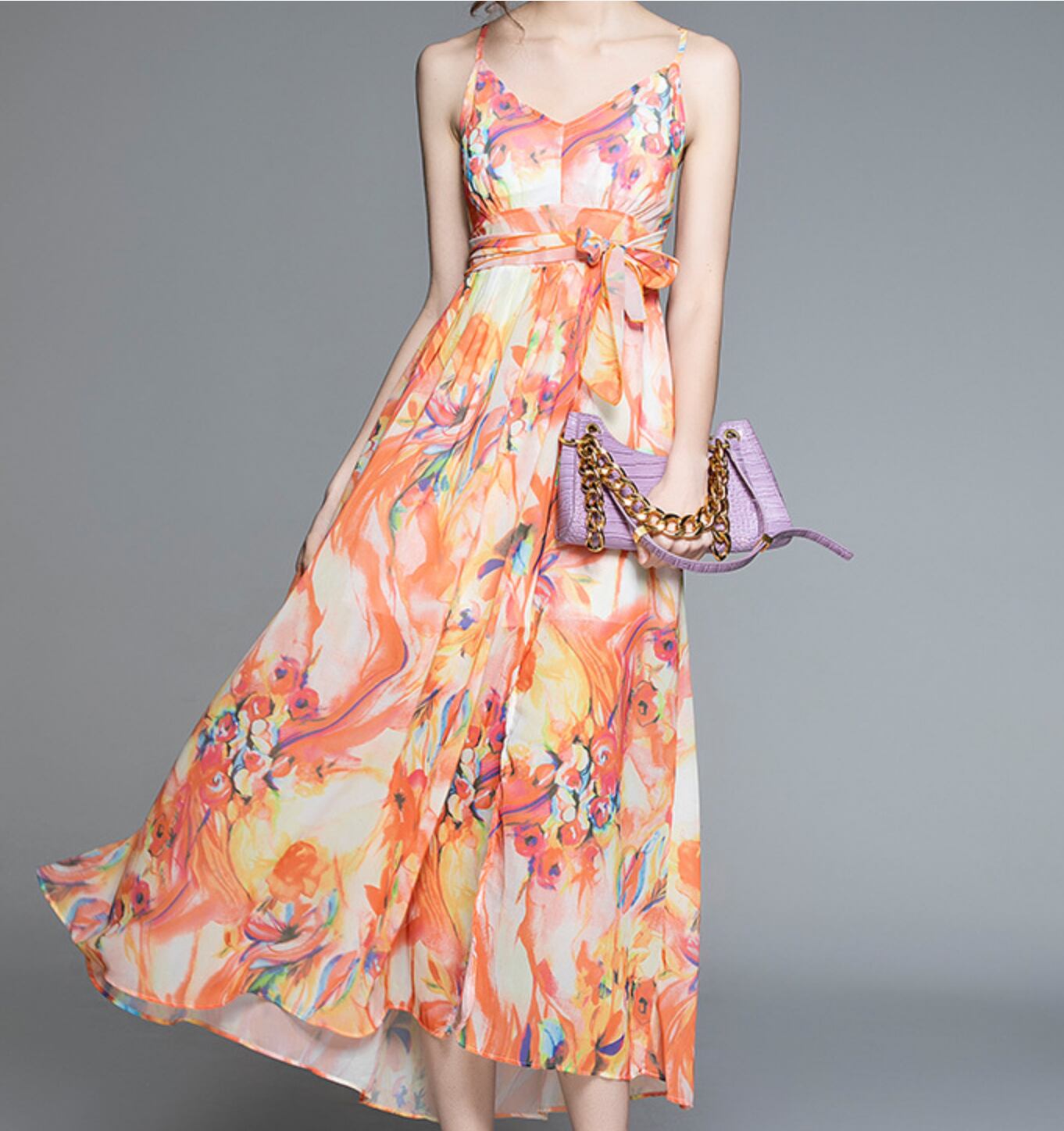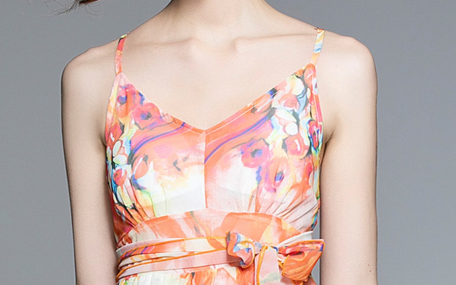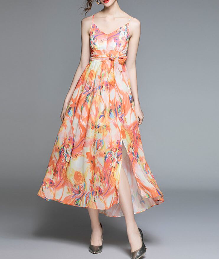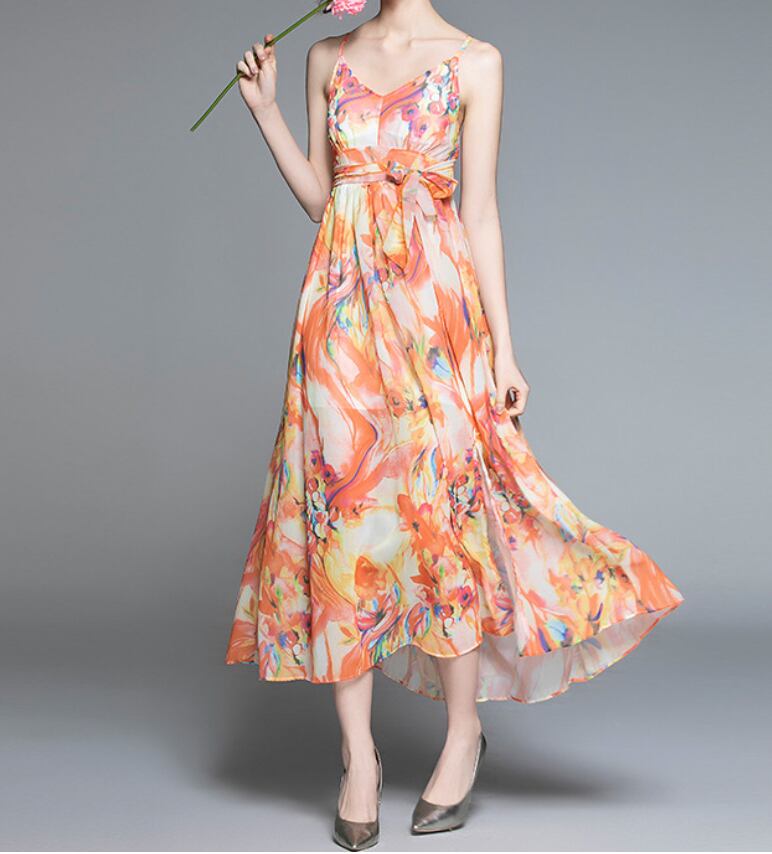 ワンピース 上着 人気 おすすめ おしゃれ お洒落 激安 安い 送料無料 プチプラ 肩出し ノースリーブ ロングスカート 背中開き 肌見せ ふんわり キャミワンピース マキシ Vネック 柄 プリント 花柄 リボン ポリエステル 春 スプリング サマー 夏 レディース 女性用 20代 30代 S M L XL 桃色 ピンク 橙 オレンジ パステルカラー 春カラー デート フェミニン ビーチ パーティー 旅行
