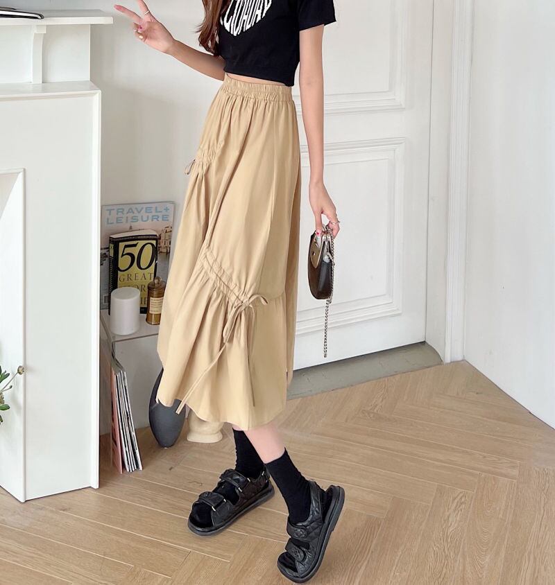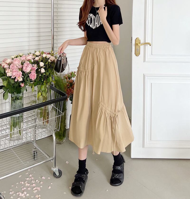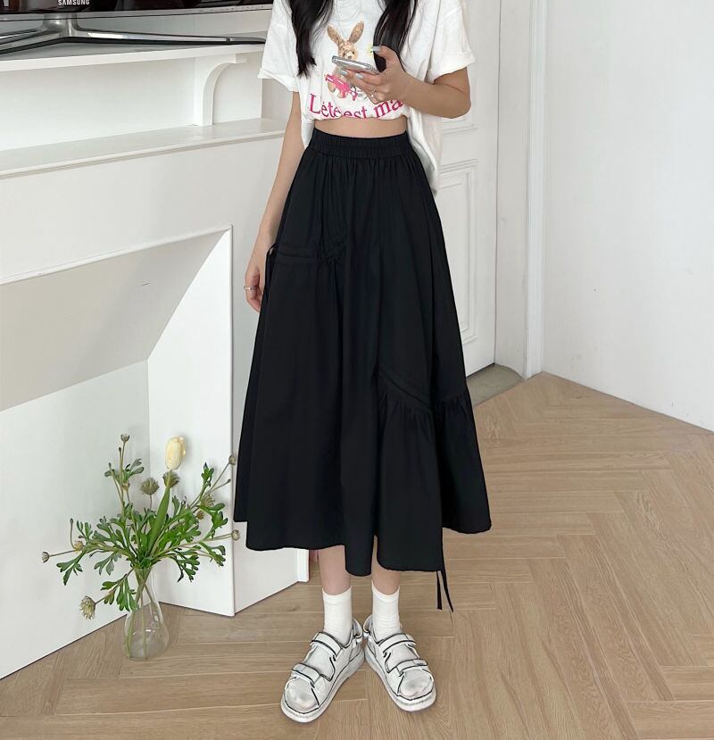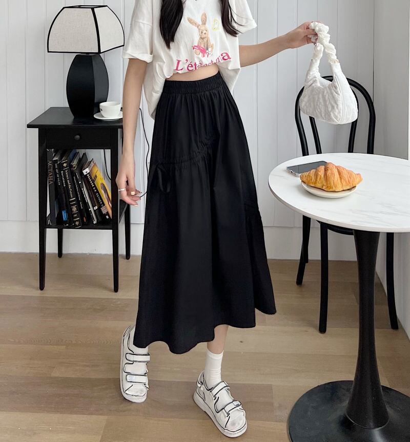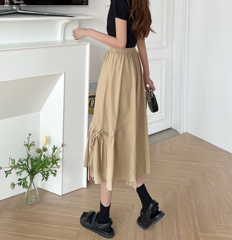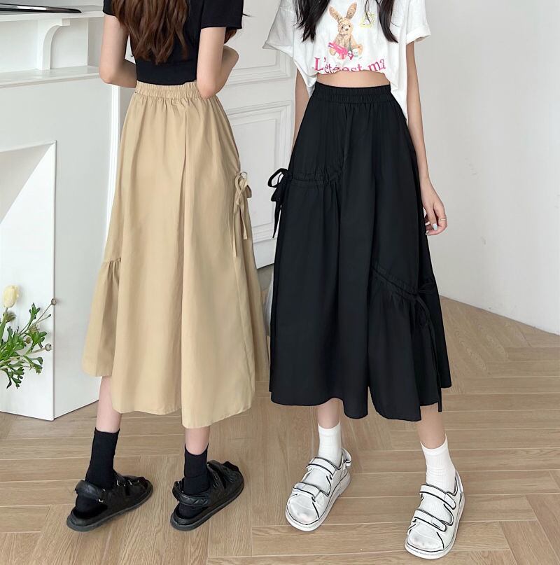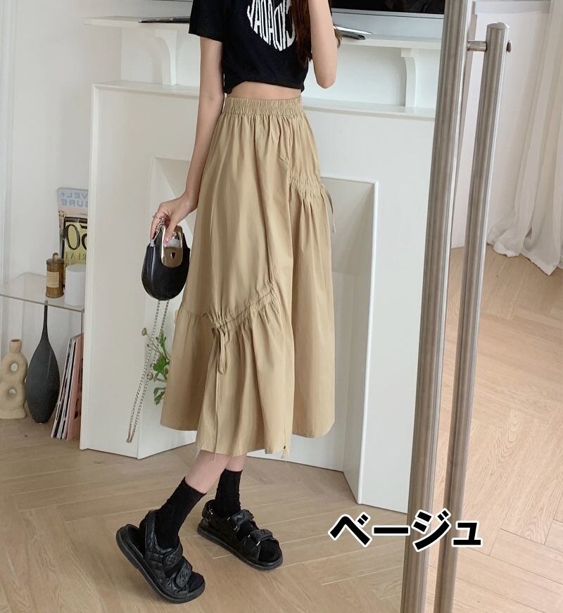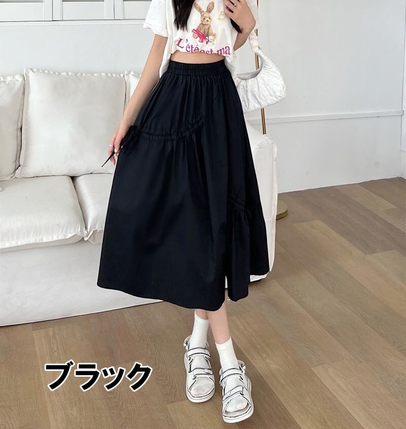 スカート ボトムス ミモレ丈 フレア リボン スカート ギャザー シャーリング ウエストゴム ボリューム モード ハイウエスト ワイド ゆったり ストレッチ 韓国 かわいい 可愛い リラックス きれいめ 楽ちん 春 スプリング 冬 ウィンター ストリート カジュアル レディースこなれ感 着回し クラシカル 上品 女性用 高校生 30代 40代 低身長 ゆったり ゆる 黒 オレンジ ホワイト ブラック