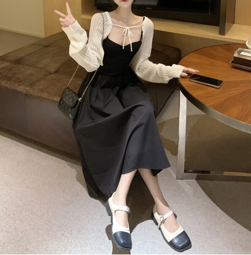 フロントのリボンが可愛いニットカーディガンとキャミワンピースのセットアップ。