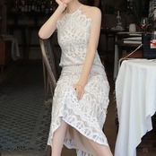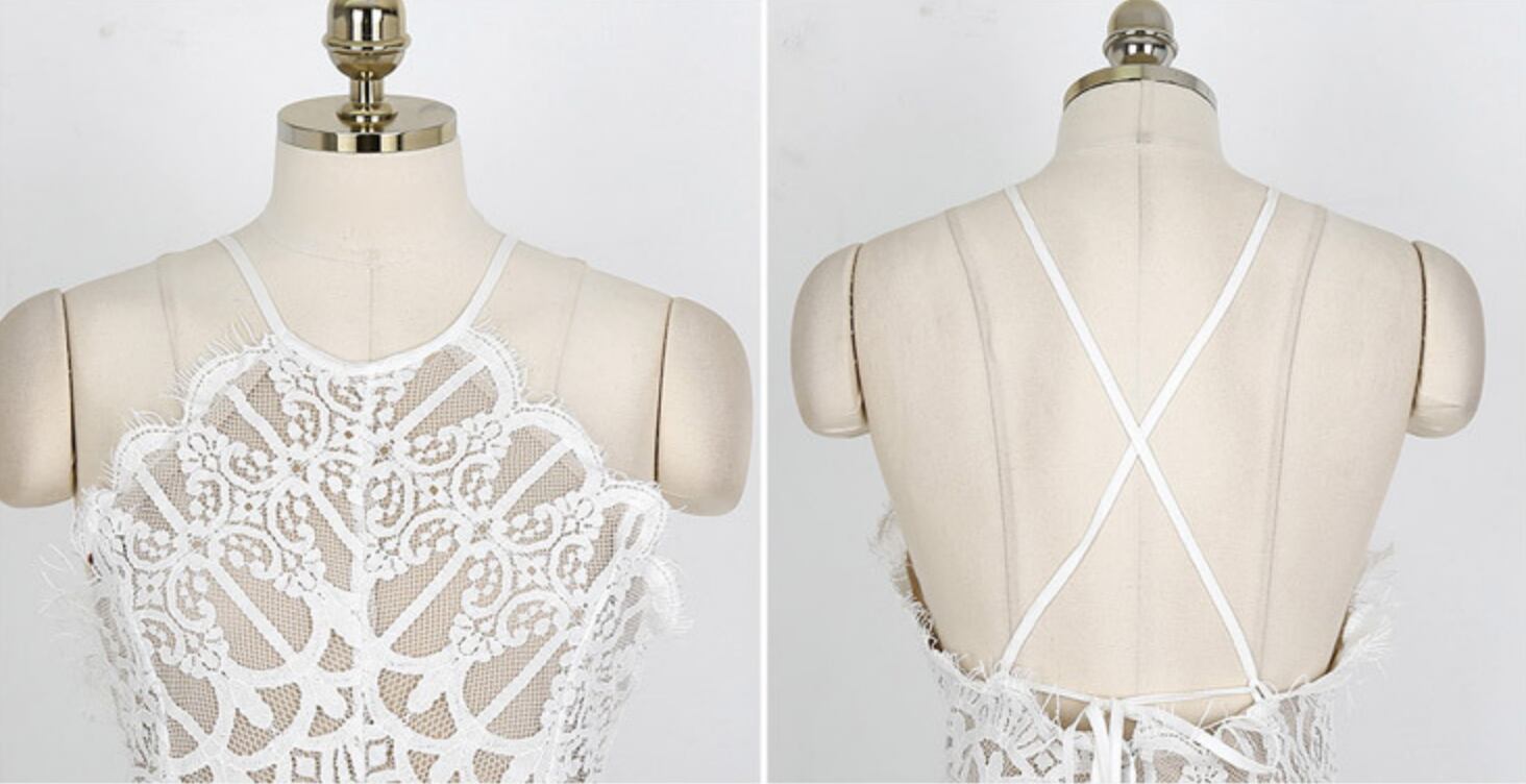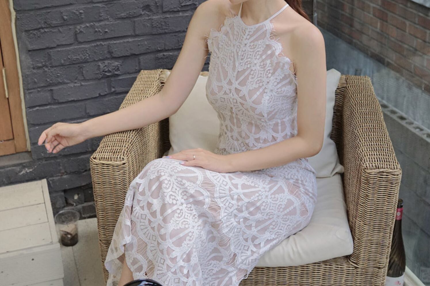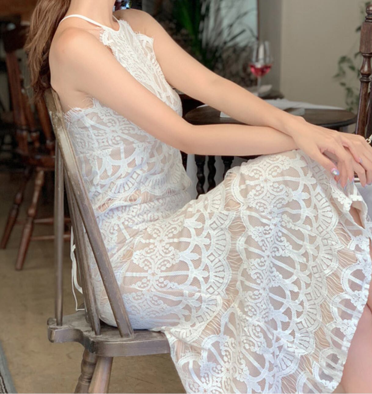 レースの生地と大きく開いた背中がセクシーなタイトワンピース。