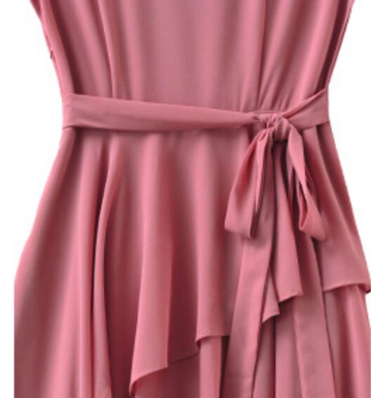 ウエストのリボンとスカートのフリルがお洒落なシンプルでありつつ様々なシーンに活用する一枚。
