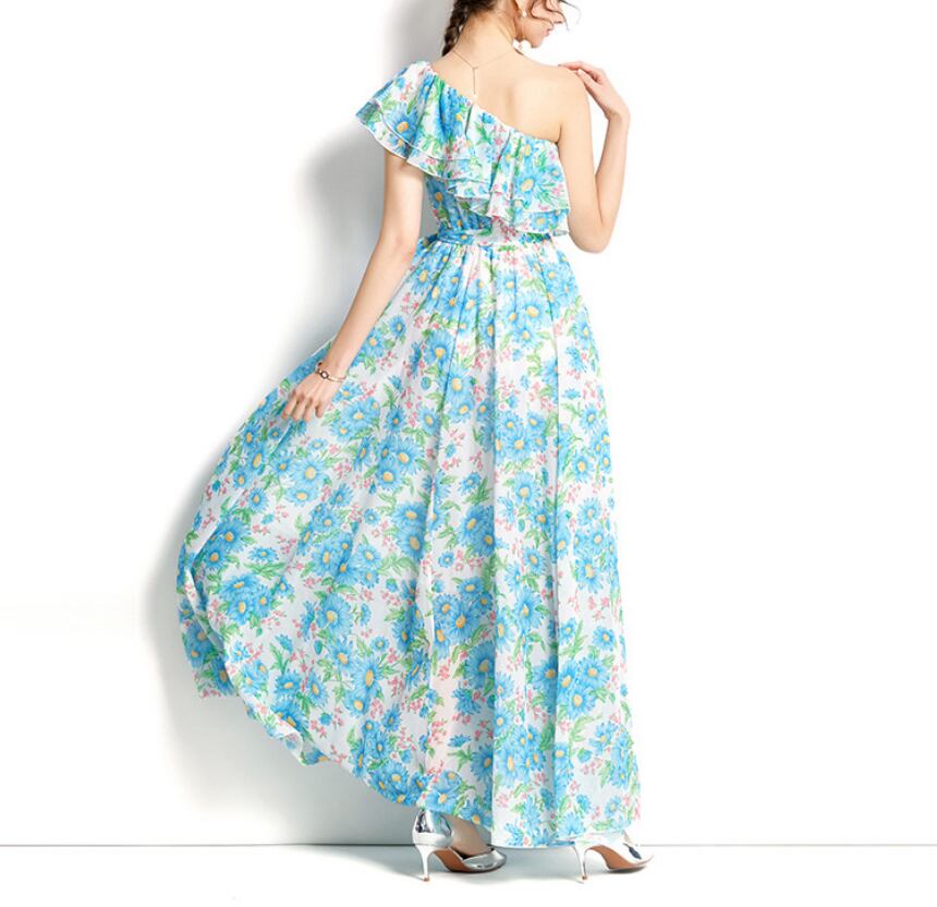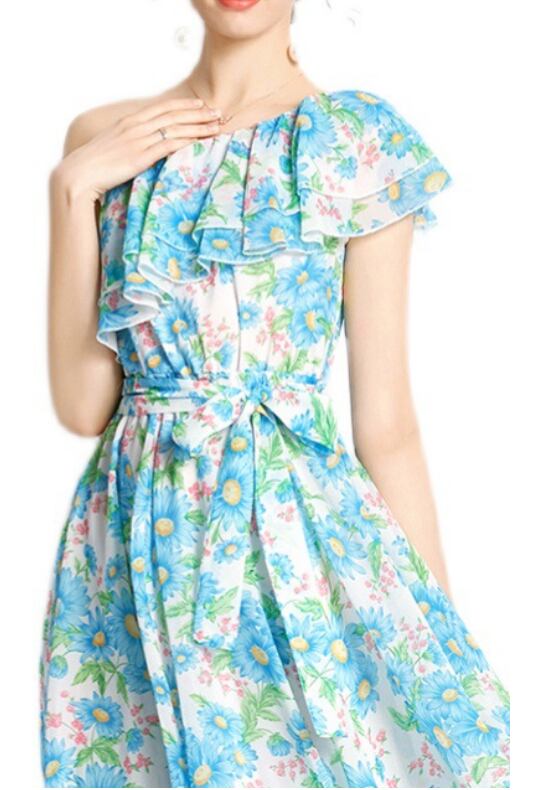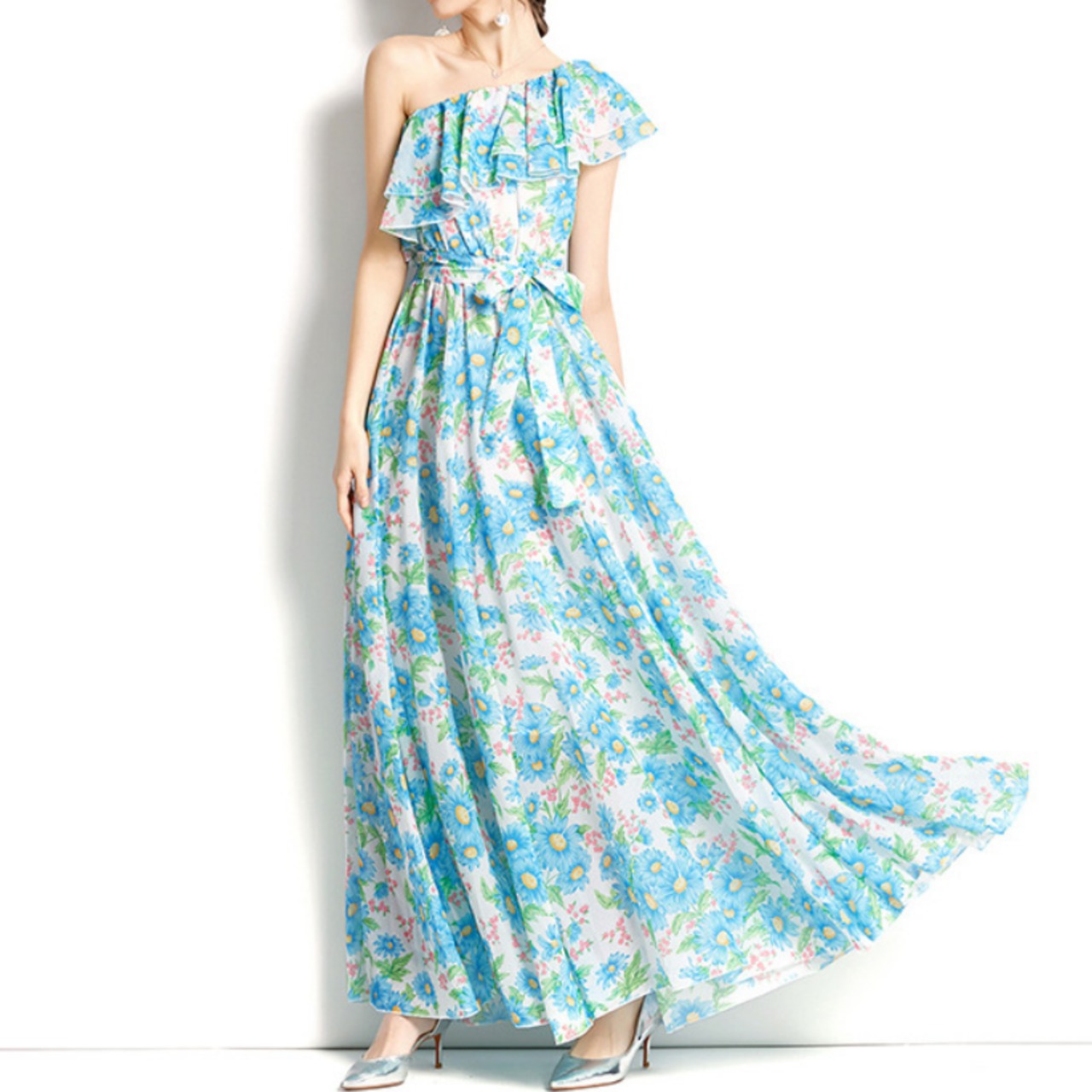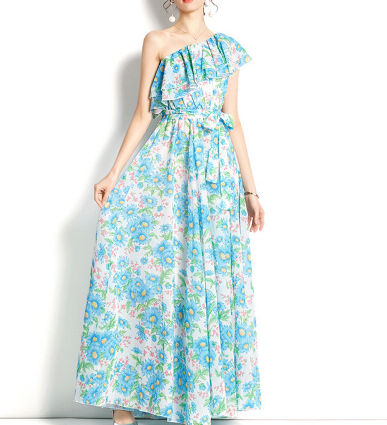 ワンピース 上着 人気 おすすめ おしゃれ お洒落 激安 安い 送料無料 プチプラ オフショルダー ワンショルダー ウエスト 肌見せ マキシ ロングスカート 肩出し バンドカラー 柄 フリル プリント 花柄 リボン ポリエステル 春 スプリング サマー 夏 レディース 女性用 20代 30代 S M L XL 2XL 青 ブルー 水色 スカイブルー 春カラー デート フェミニン シック ビーチ