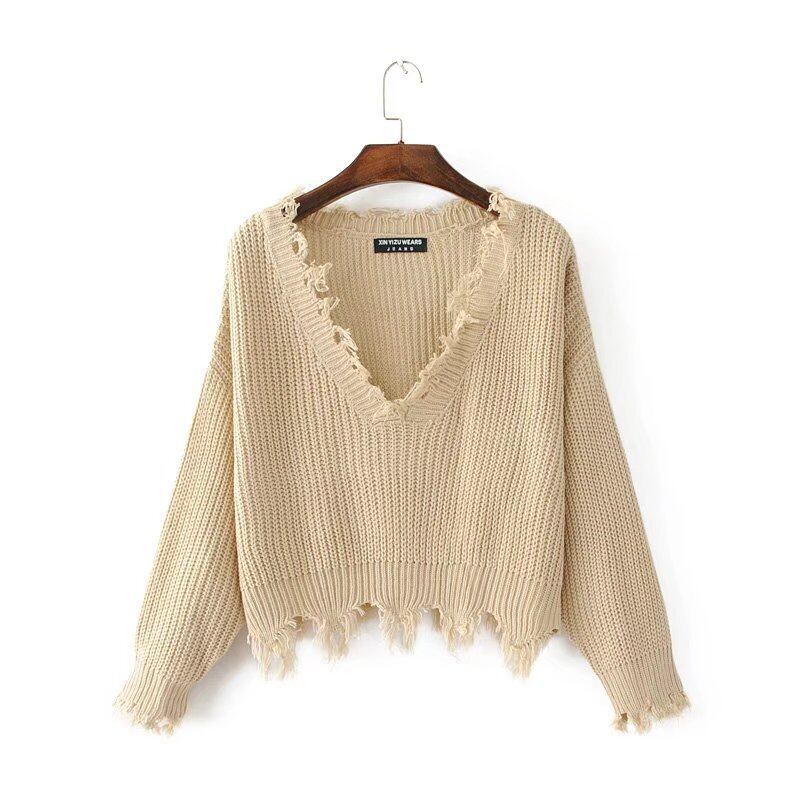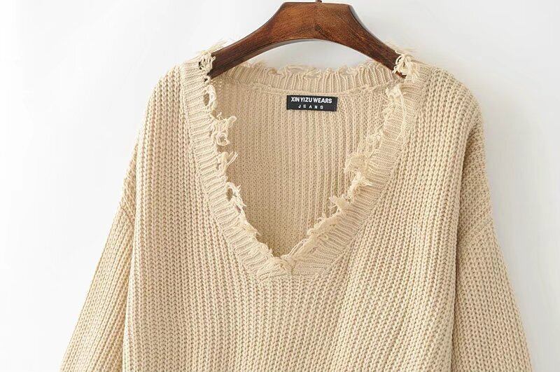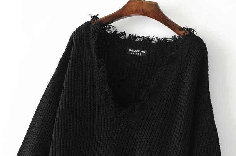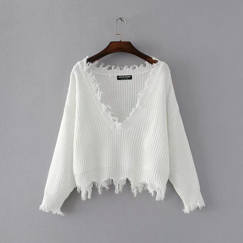 トップス セーター 袖あり 長袖 Vネック 異素材MIX かわいい カジュアル お洒落 かっこいい エキゾチック ラフ 個性的 クール モード系 抜け感 ヴィンテージ風 無地 秋 冬 10代 20代 韓国系 オルチャン ファッション ダメージ サイズ フリーサイズ ゆる ホワイト ブラック ベージュ