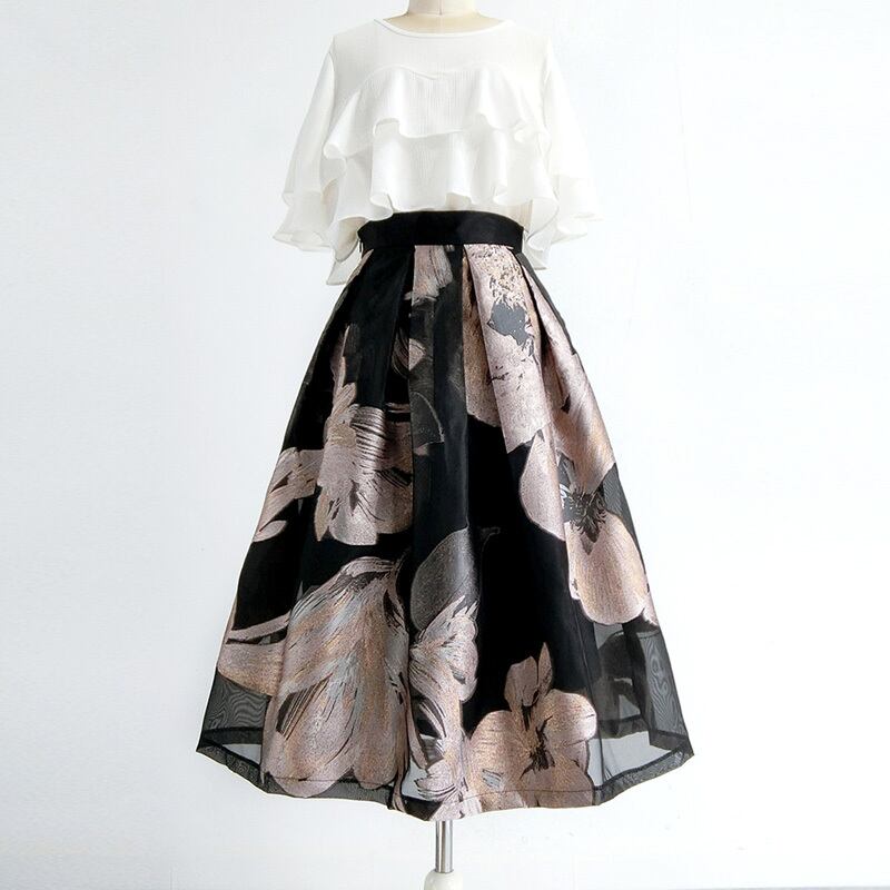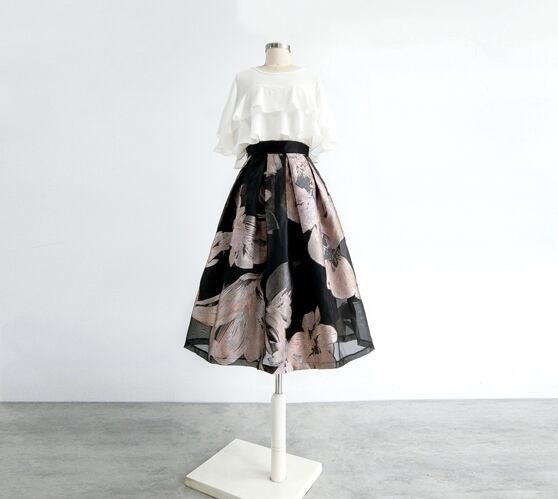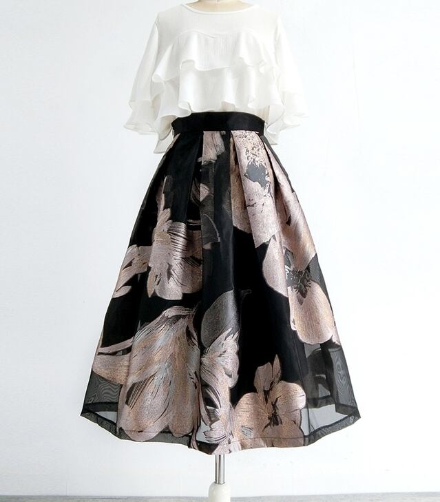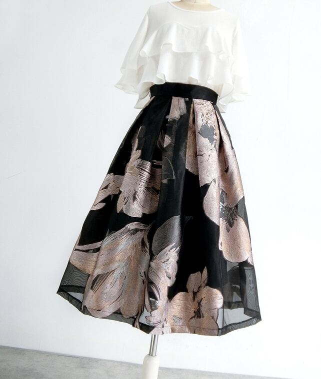 スカート ボトムス ミモレ丈 フレア ミディアム丈 スカート ギャザー 花柄 ボタニカル タック シック フラワー フローラル ウエストゴム ボリューム モード ハイウエスト ワイド ゆったり ストレッチ 韓国 かわいい 可愛い リラックス きれいめ 楽ちん 春 スプリング 冬 ウィンター ストリート カジュアル レディースこなれ感 着回し クラシカル 上品 女性用 高校生 30代 40代 低身長 ゆったり ゆる 黒 ホワイト ブラック