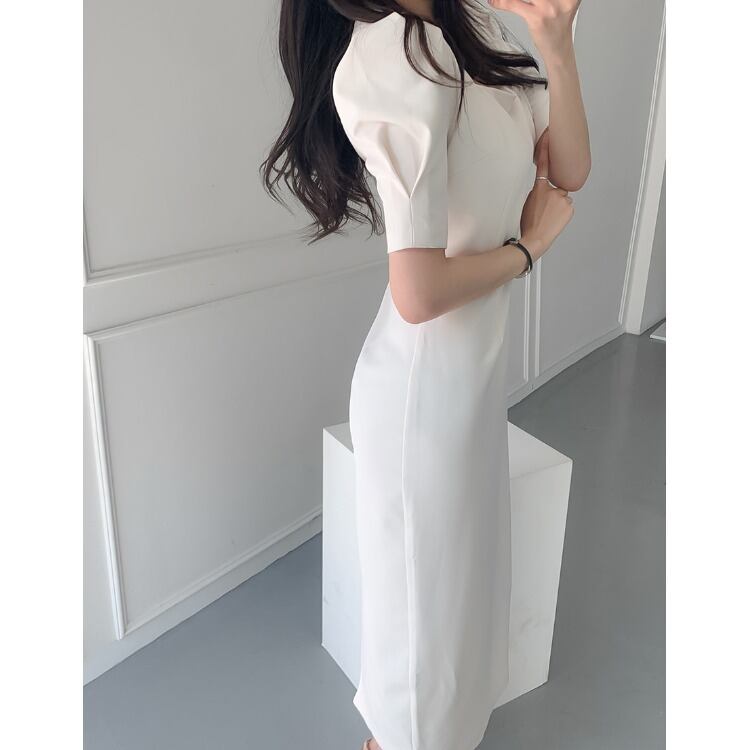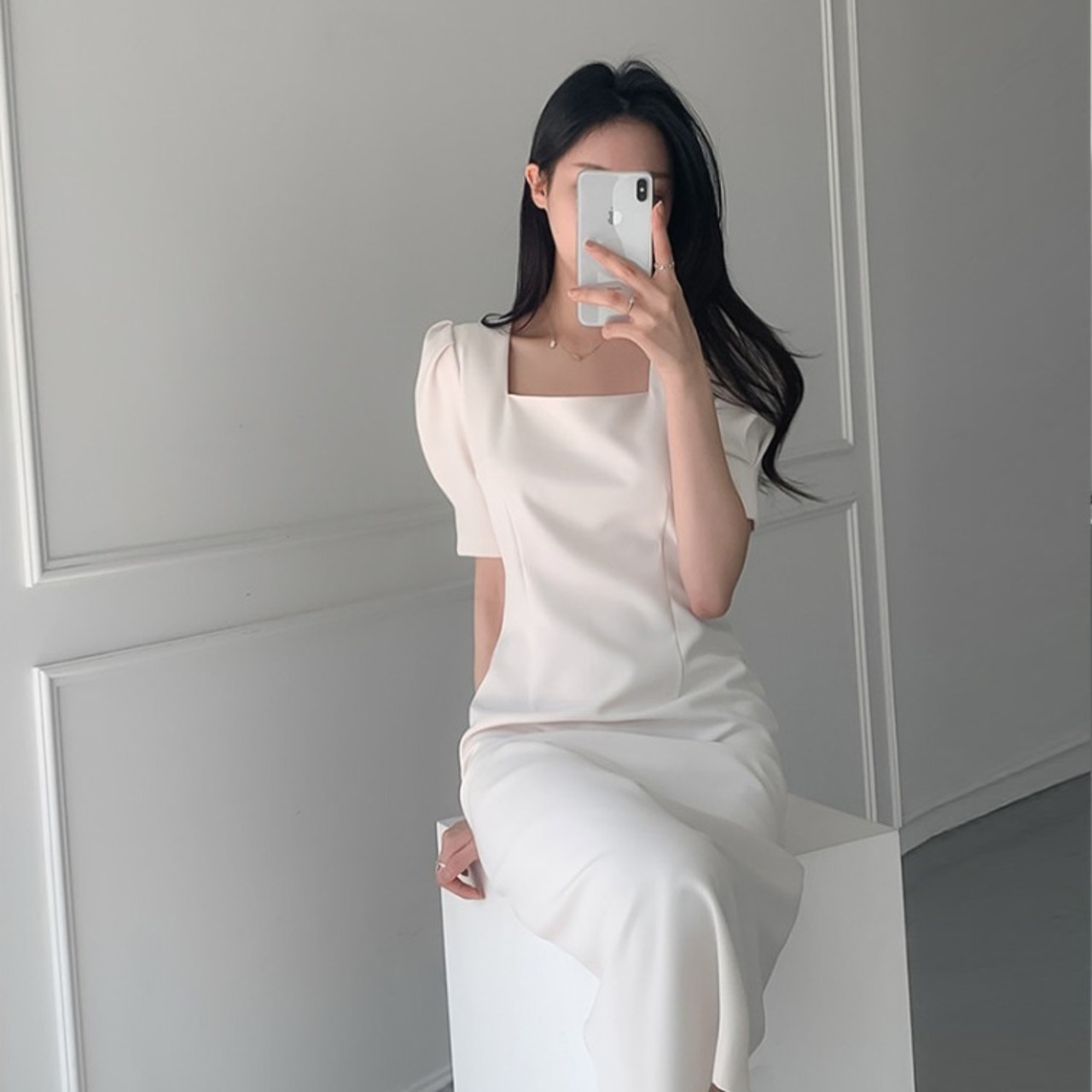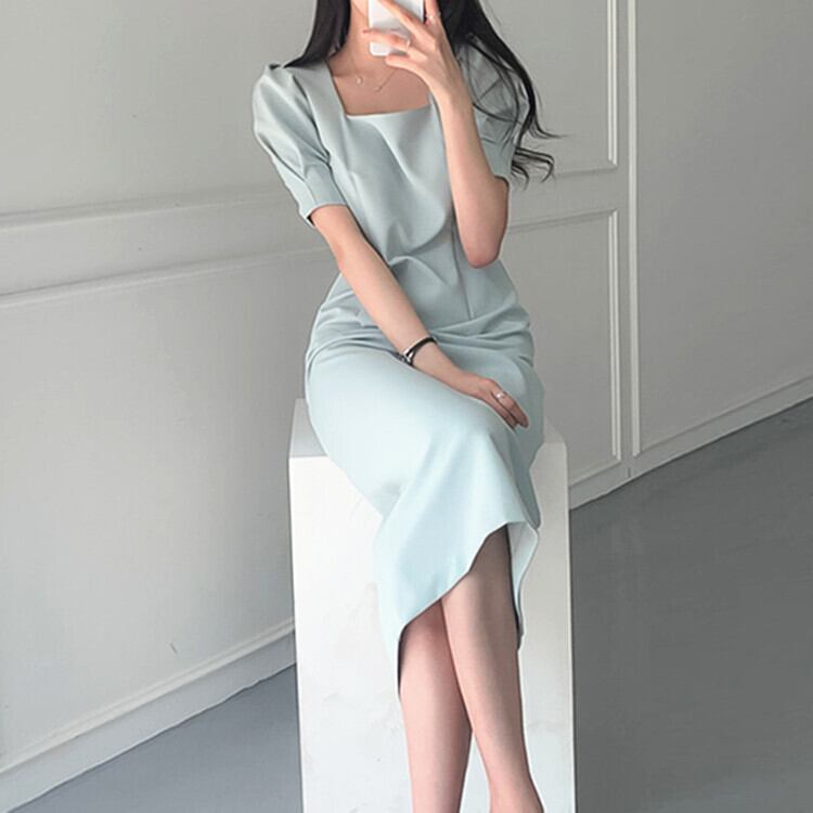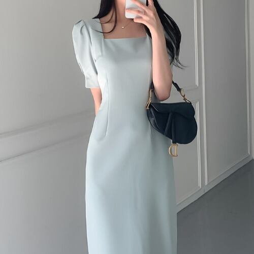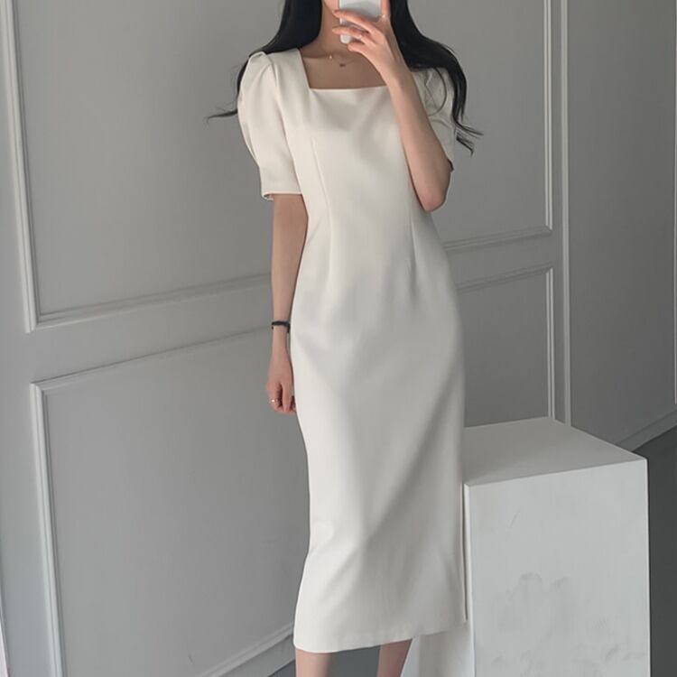 ワンピース 上着 人気 おすすめ おしゃれ お洒落 激安 安い 送料無料 プチプラ 半袖 スクエアネック タイト ボリュームスリーブ ミモレ丈 無地 コットン 綿 ポリエステル 可愛い かわいい 韓国 シンプル きれいめ 大人 上品 フォーマル 春 スプリング サマー 夏 レディース 女性用 20代 30代 S M L 白 ホワイト 青 ブルー 水色 スカイブルー パステルカラー 春カラー デート フェミニン オフィス
