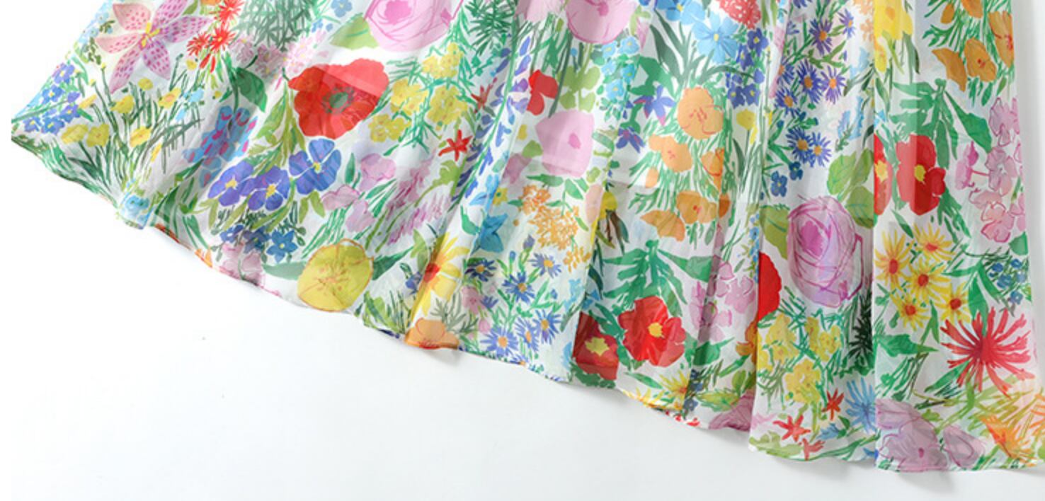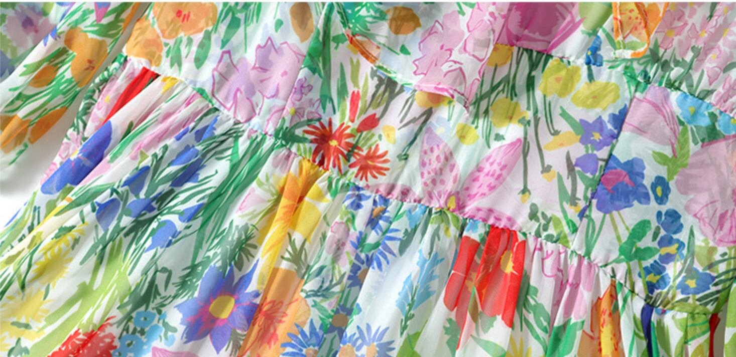 カラフルなフラワープリントがお洒落なロングワンピース。