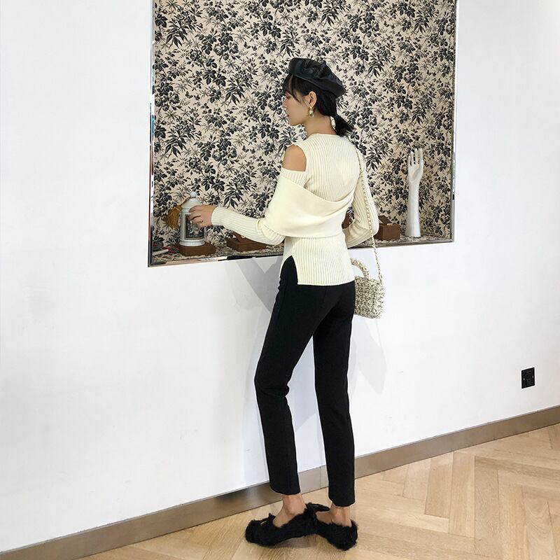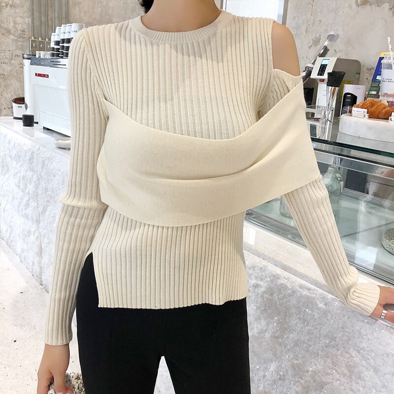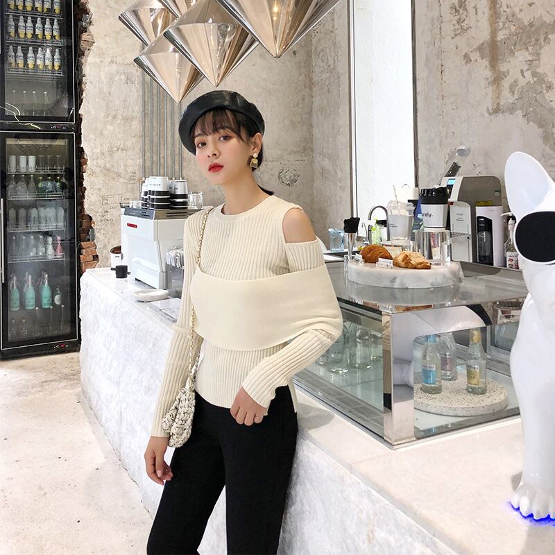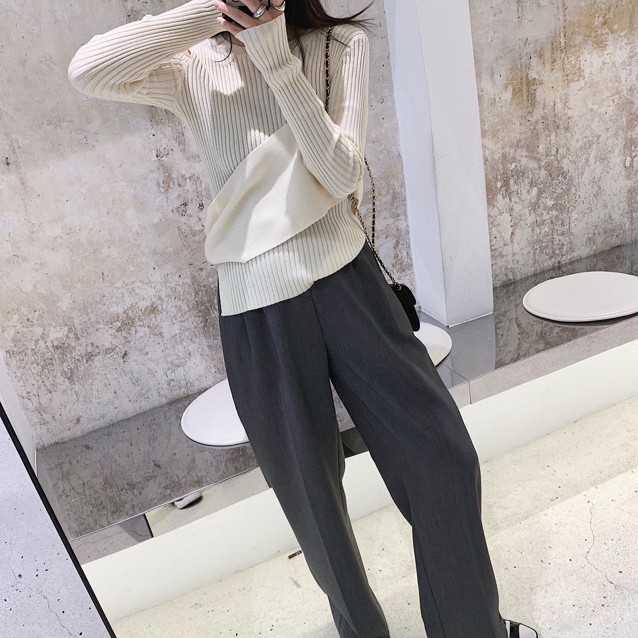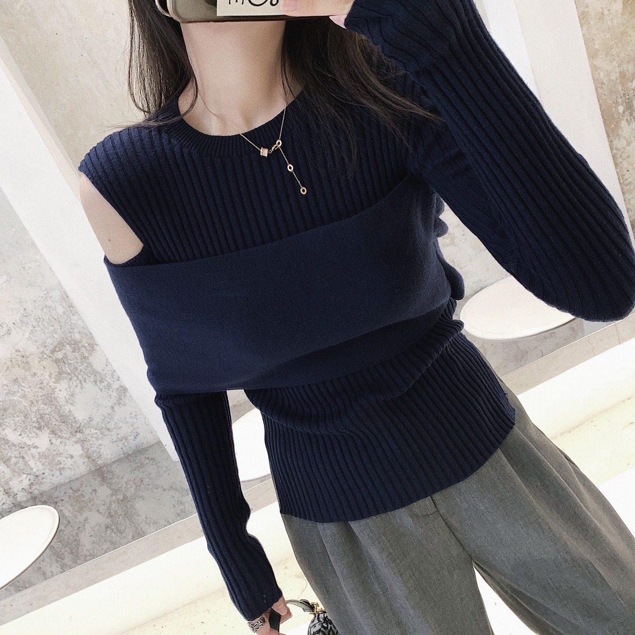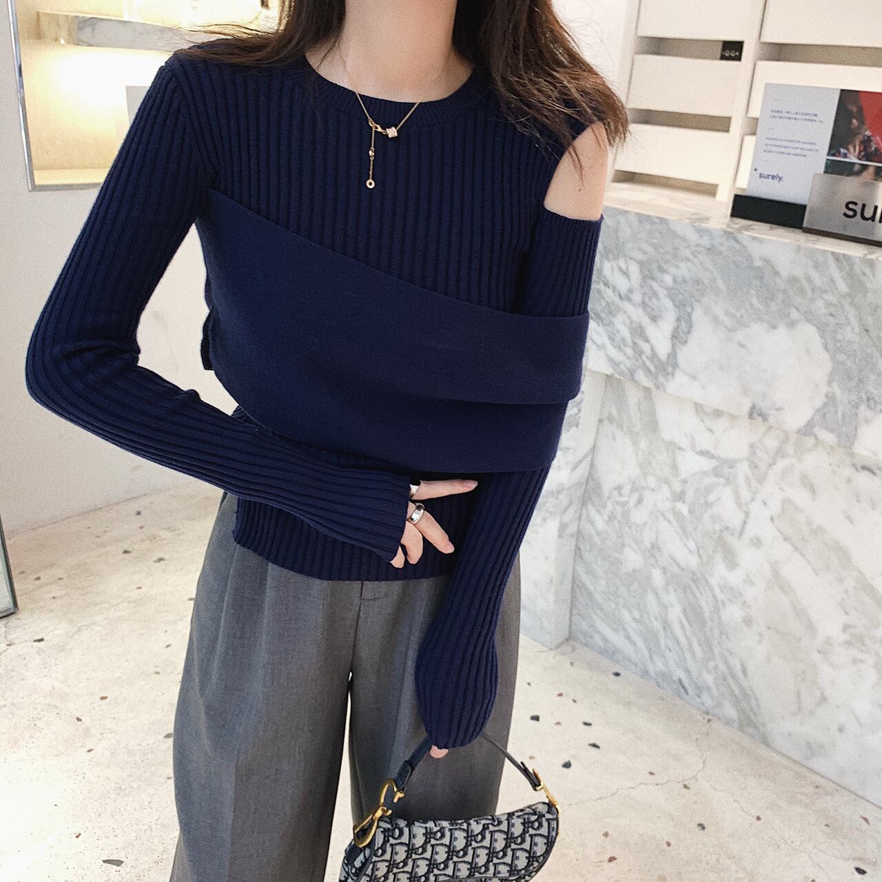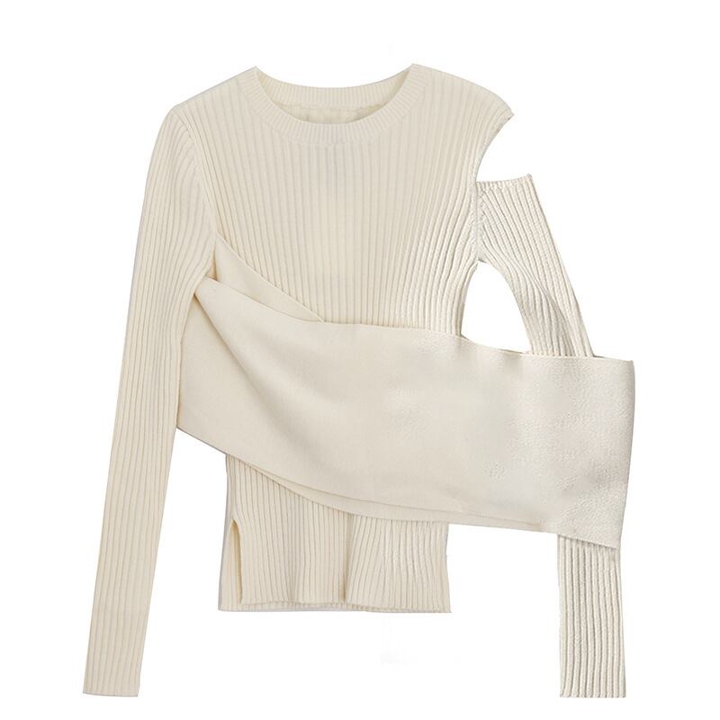 ベーシックなリブニットにワンスリーブ肩開きを施した女度が上がるトップス。