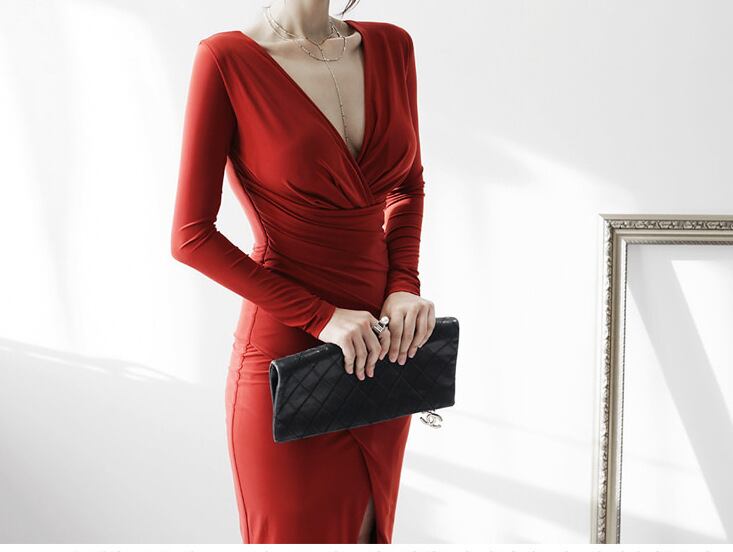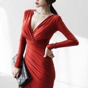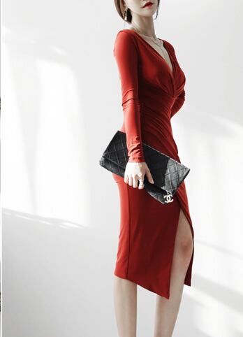タイト ワンピース ドレス Vネック 長袖 セクシー スリム ひざ丈 スリット ハイウエスト かわいい 大人可愛い きれいめ シンプル カジュアル 大人 上品 おしゃれ お洒落 かっこいい 大人可愛い 大人女子 こなれ感 ラフ ラブリー キュート ガーリー ルーズ モード系 10代 20代 30代 パーティー お呼ばれ 二次会 レディース デート お出かけ 着回し 普段使い 重ね着 韓国系 オルチャン ファッション コーデ 楽ちん 体系カバー 激安 送料無料 流行 インスタ映え 赤 レッド