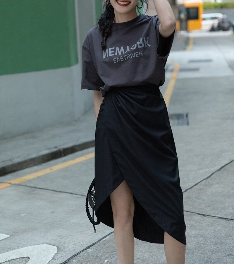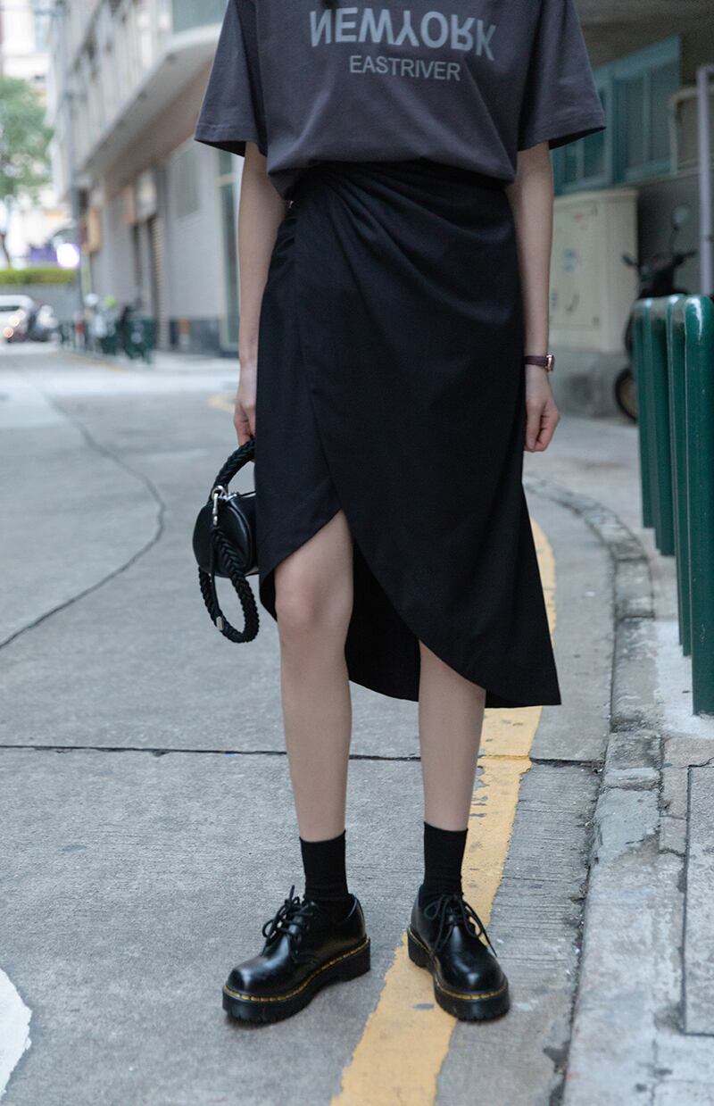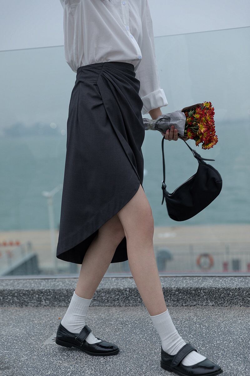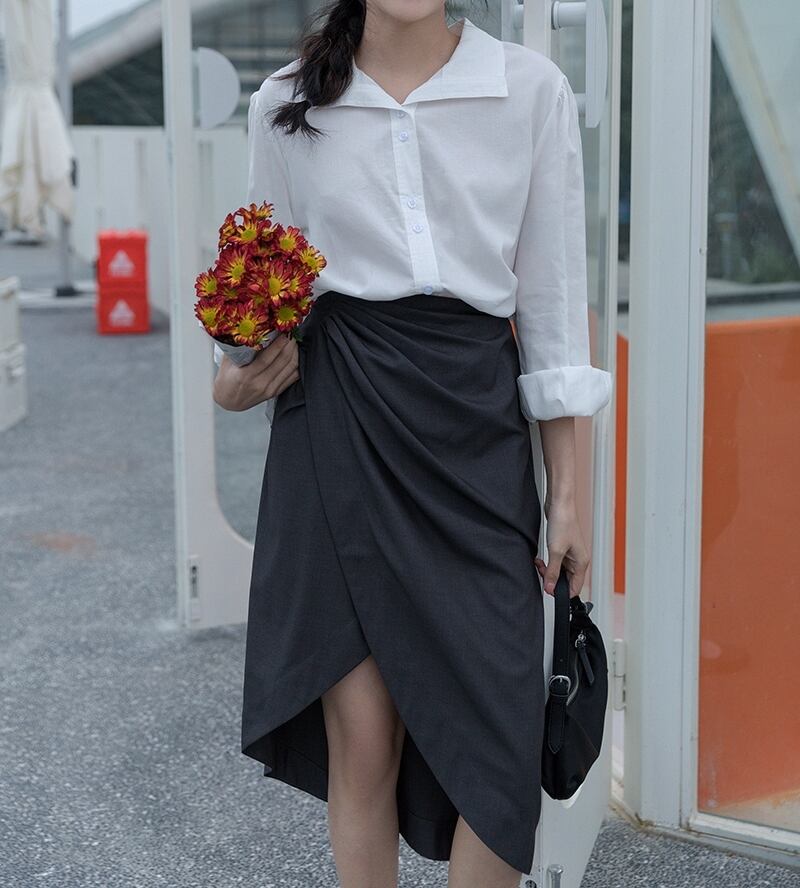 ボディラインを綺麗に見せるラップ風アシンメトリースカートです。