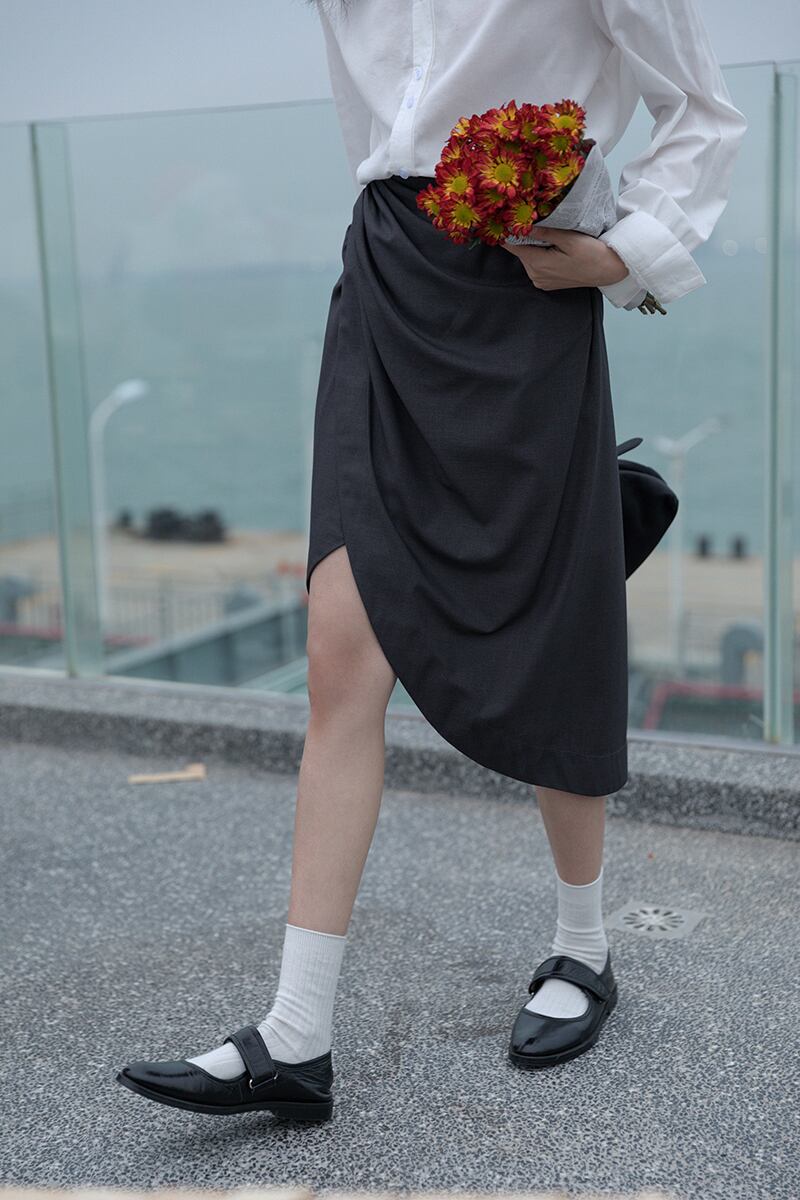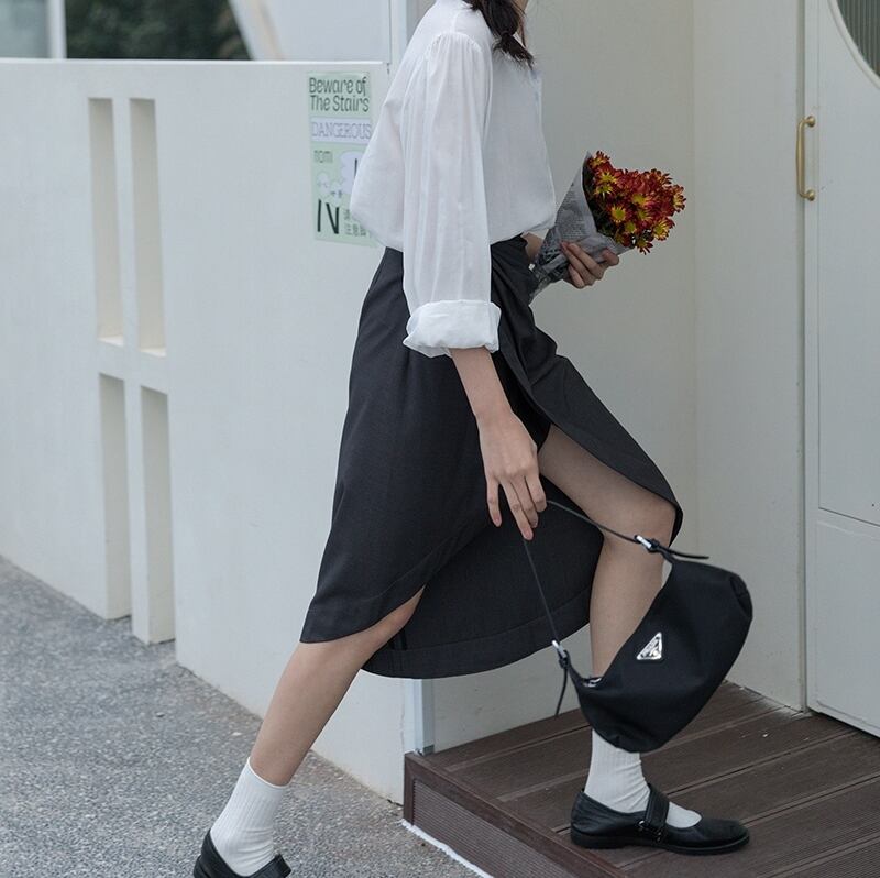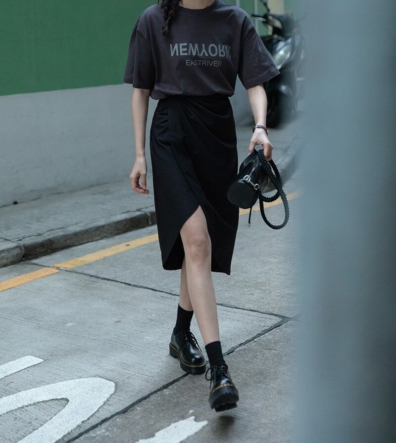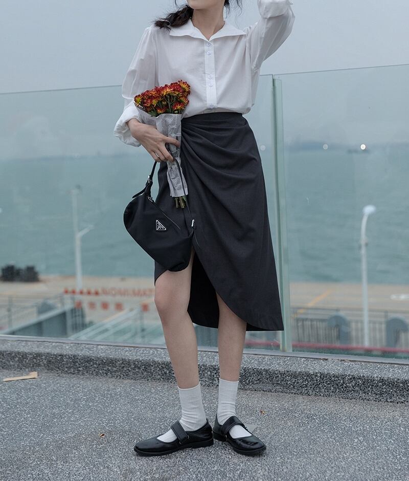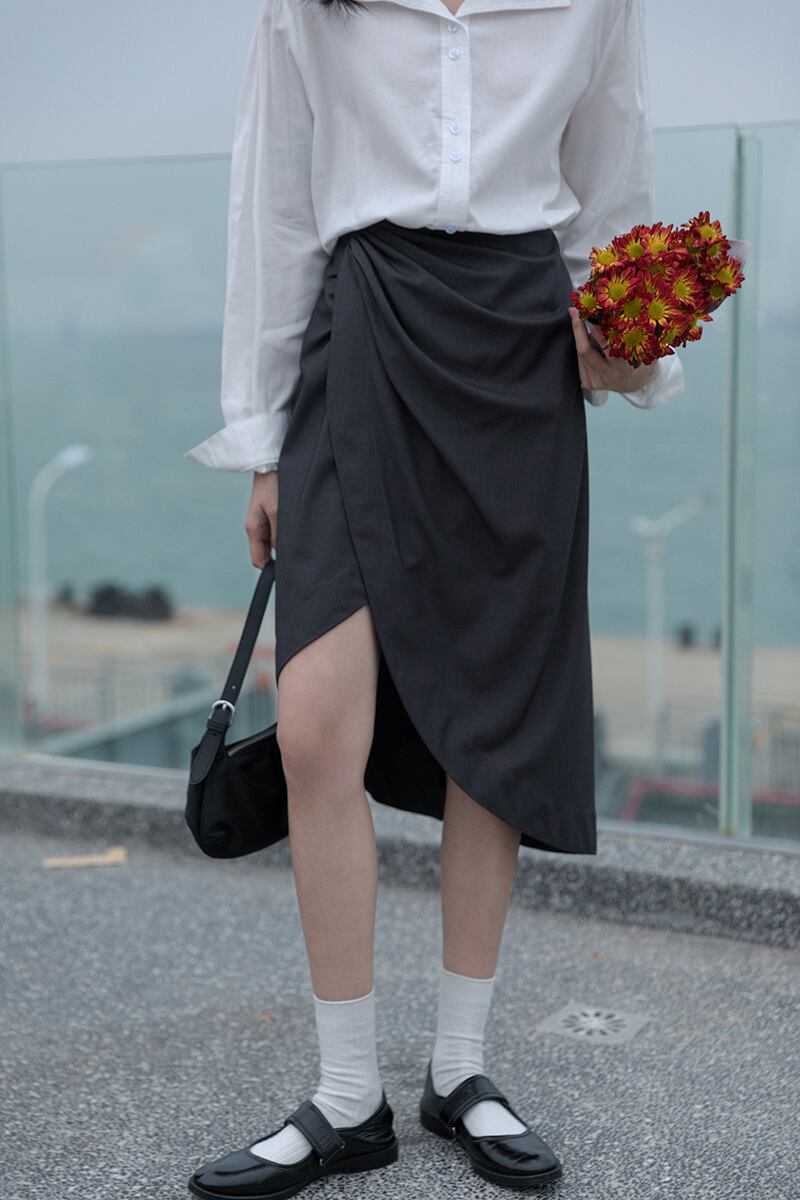 ボディラインを綺麗に見せるラップ風アシンメトリースカートです。