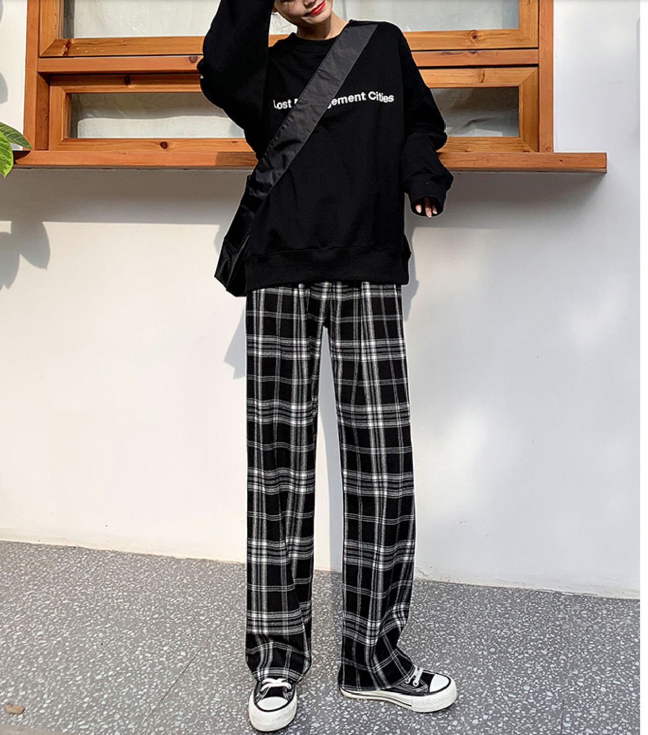 チェック柄がかわいいワイドゆったりパンツ。