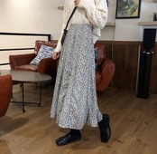 レトロなモノトーンの小花柄プリントのミモレ丈フレアスカートです。