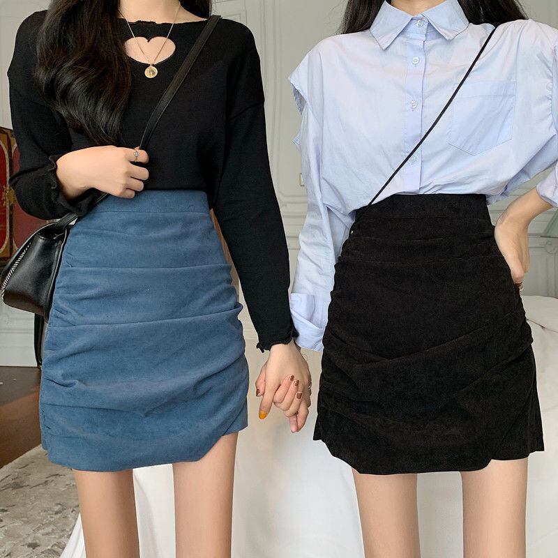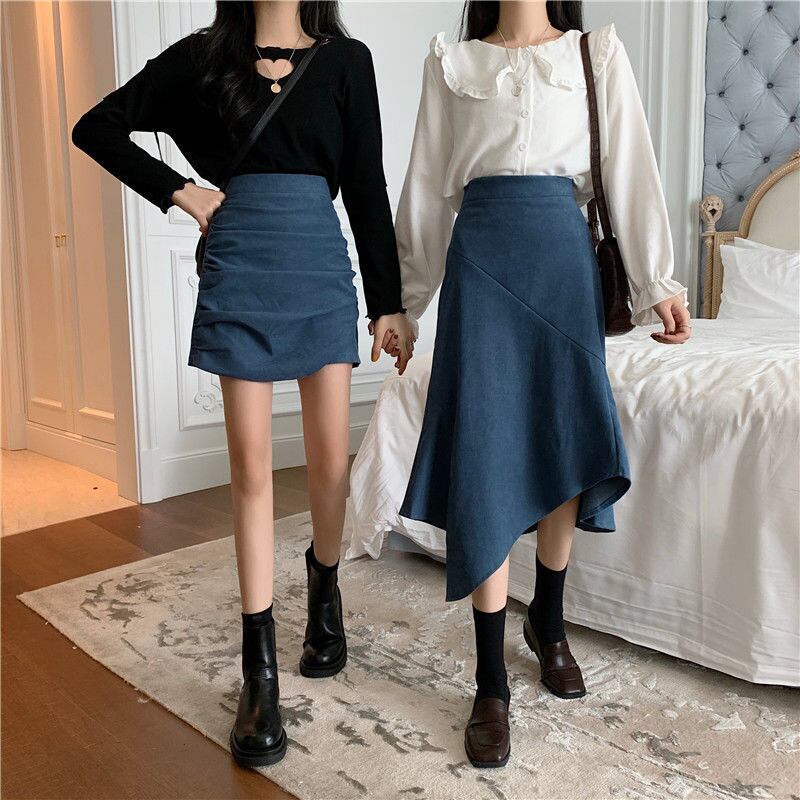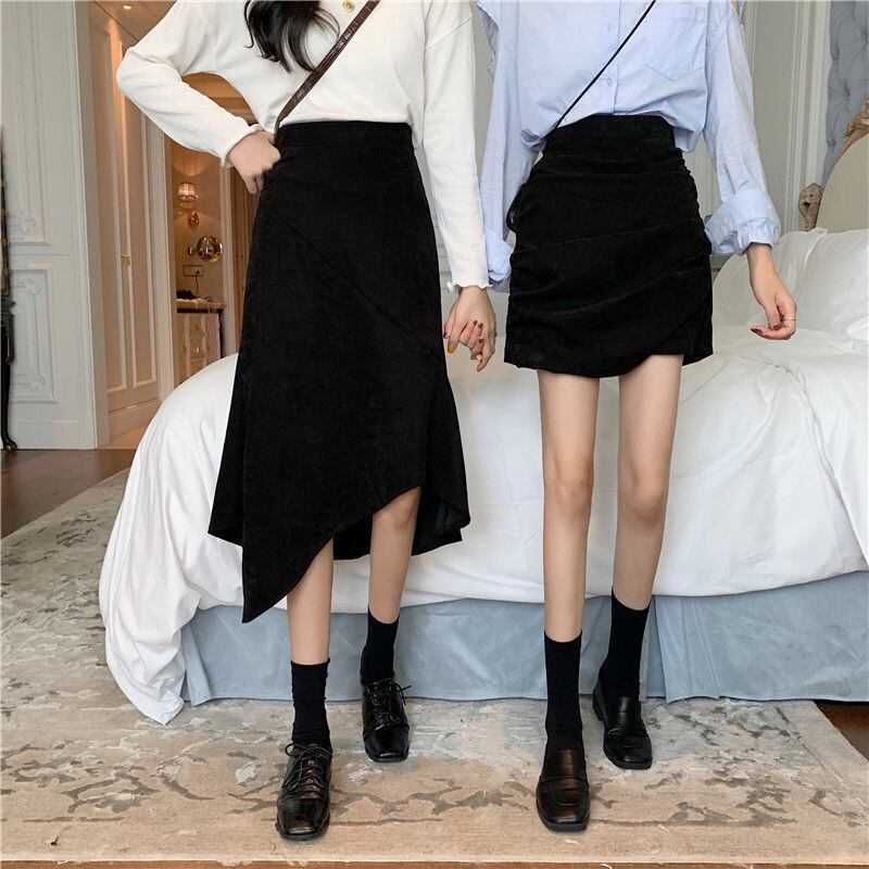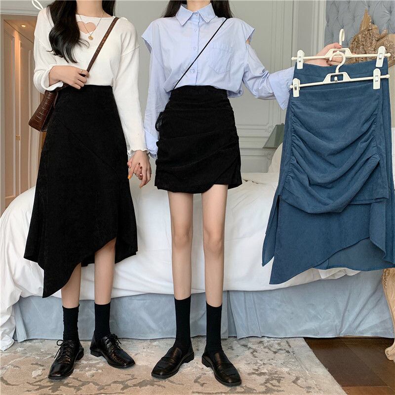 サイドのギャザーが可愛いミニスカ―トとランダム裾のミモレ丈スカートです。
