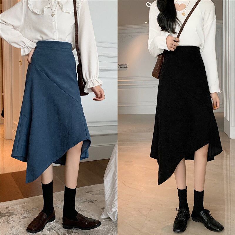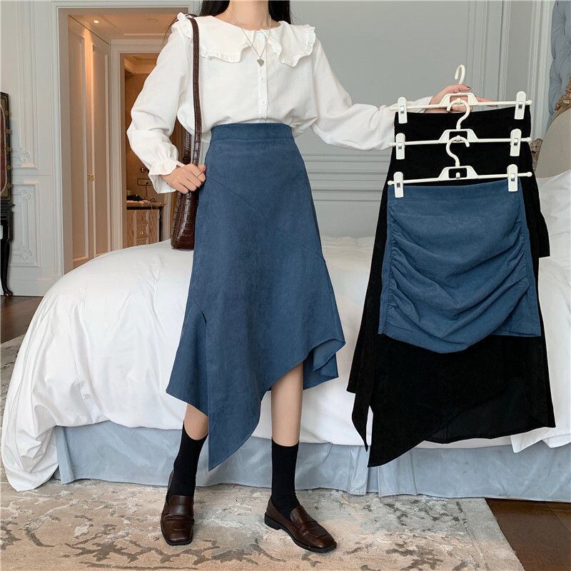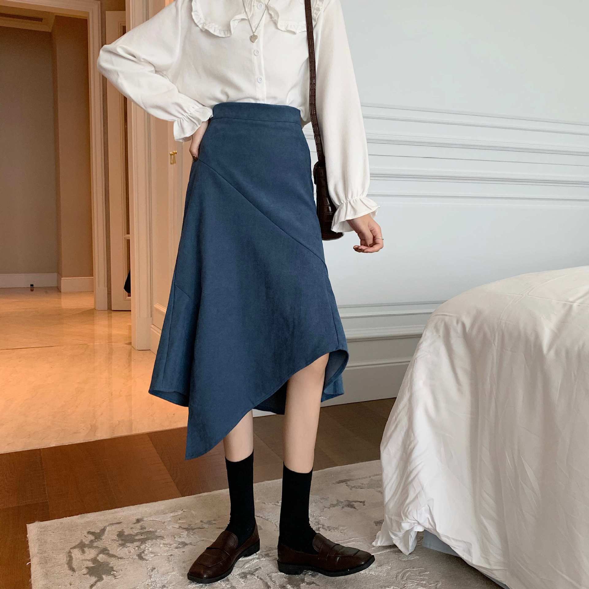 スカート ボトムス ミモレ丈 フレア スカート ギャザー アシンメトリー シャーリング ハイウエスト 切り替え ボリューム モード ワイド ゆったり ストレッチ 韓国 かわいい 可愛い リラックス きれいめ 楽ちん 春 スプリング 冬 ウィンター ストリート カジュアル レディースこなれ感 着回し クラシカル 上品 女性用 高校生 30代 40代 低身長 ゆったり ゆる 黒 ブラック ブルー