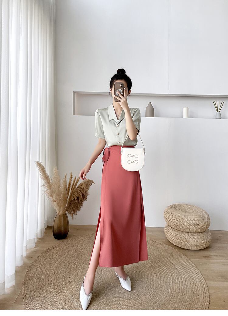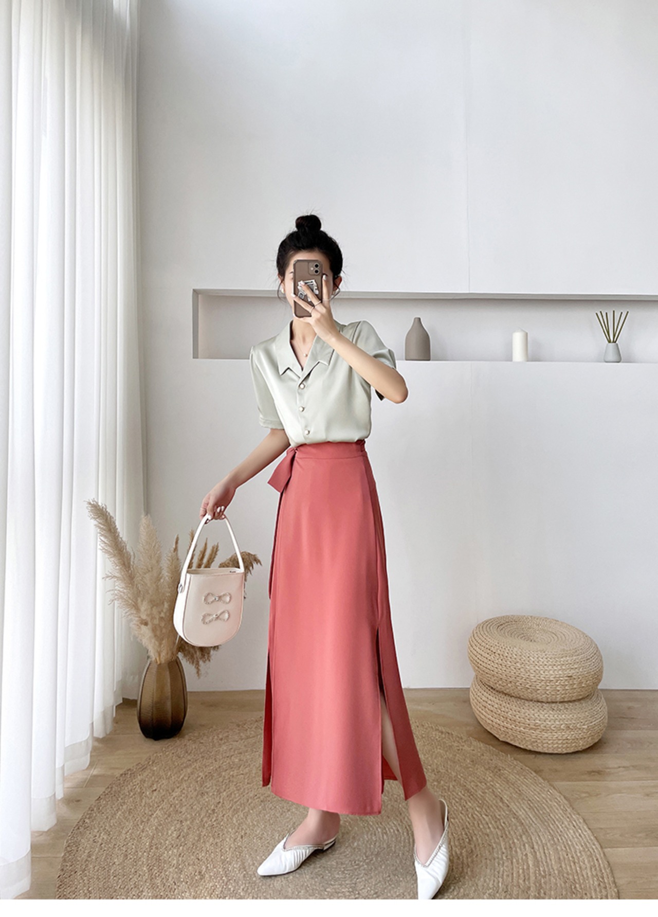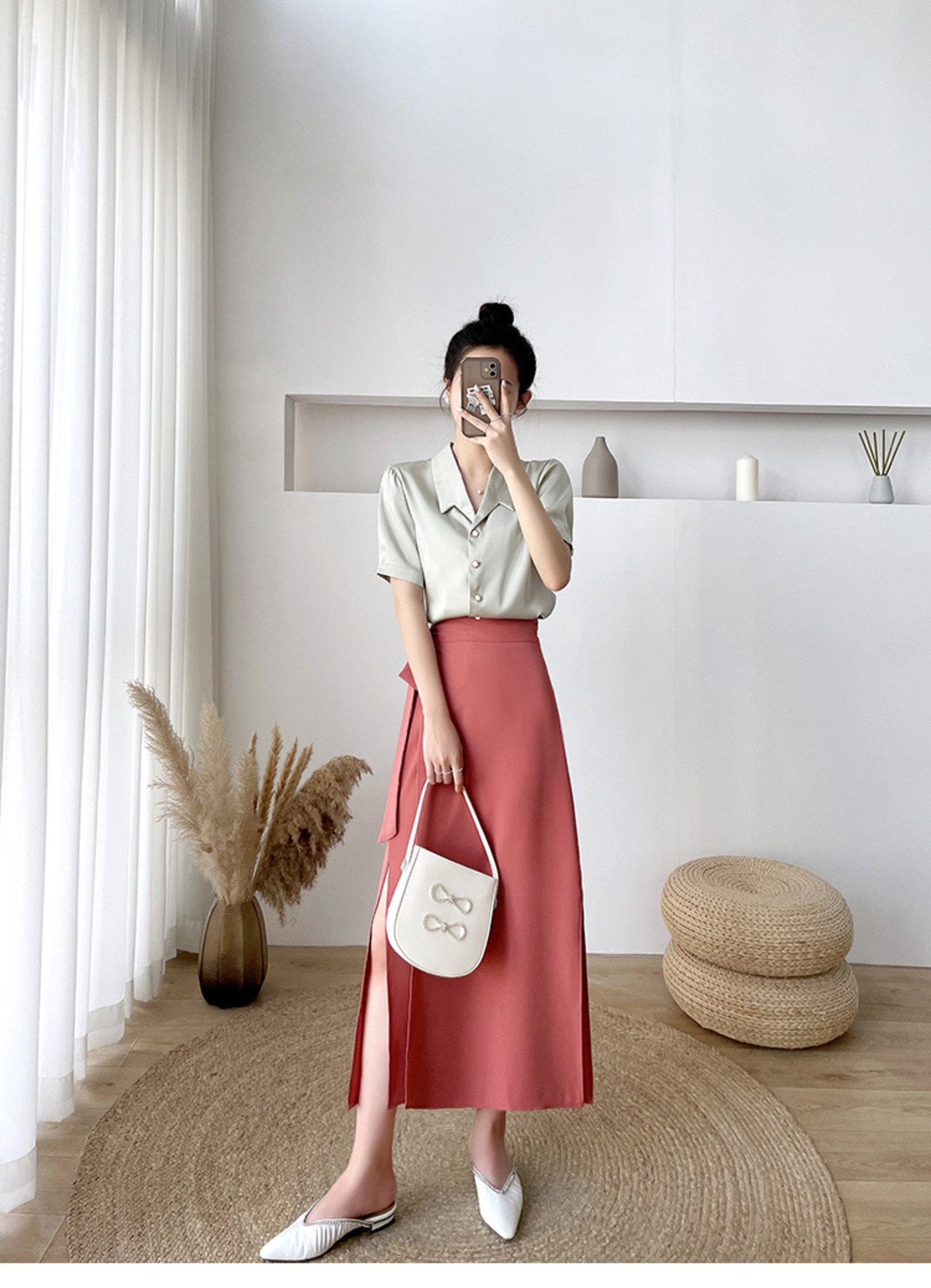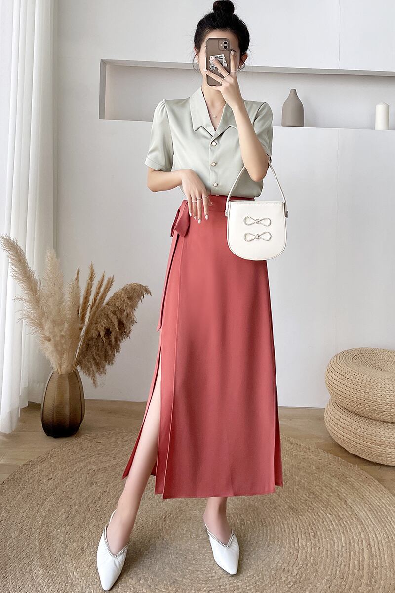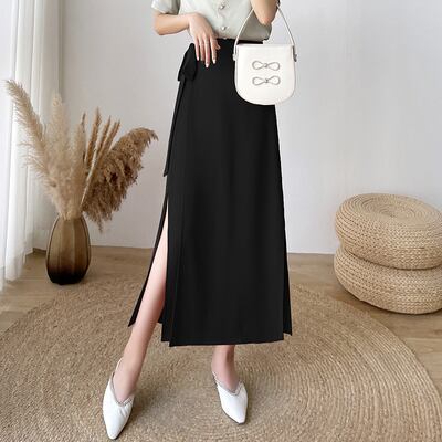 サイドの大きなリボンとスリットでフェミニンなシルエットの一枚。