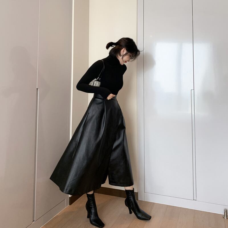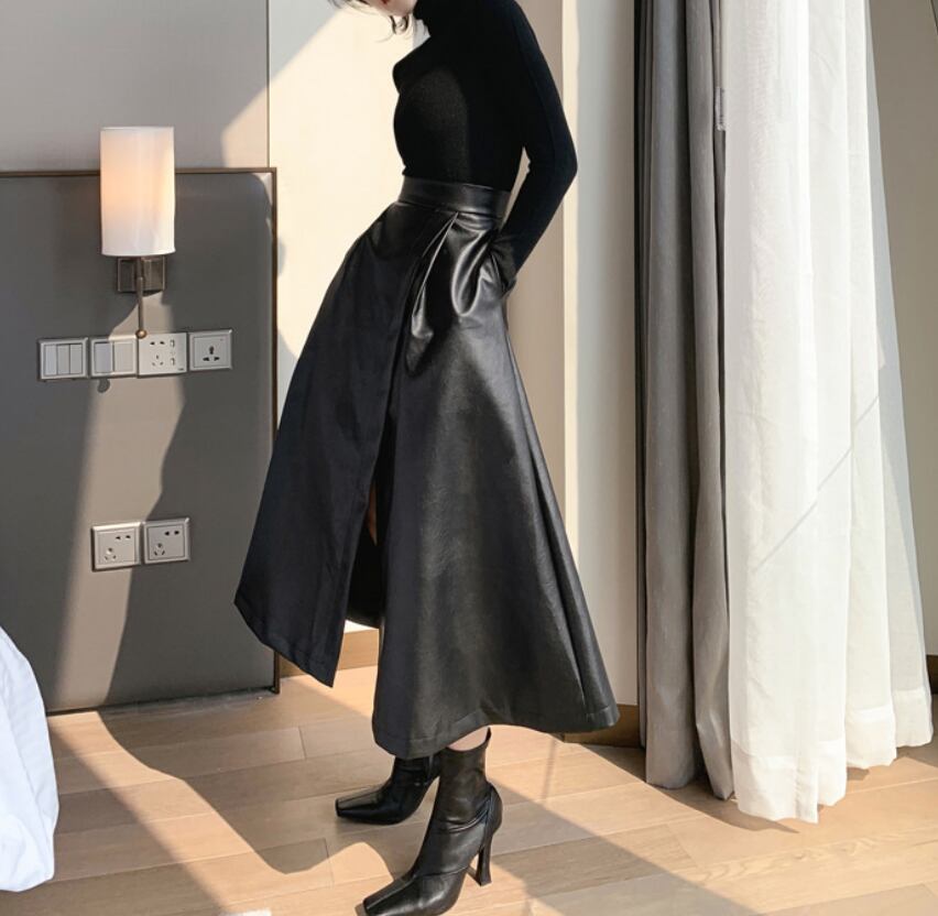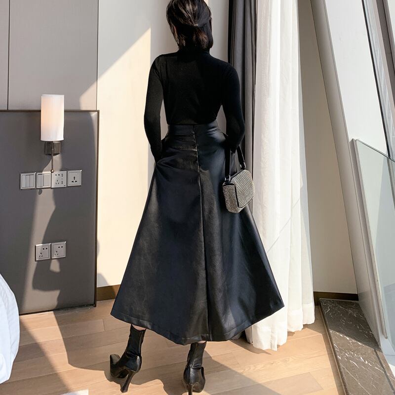 ボトムス ボトム おすすめ おしゃれ お洒落 激安 安い 送料無料 プチプラ スカート ロング スカート スリット スカート ハイ ウエスト Aライン ミモレ 丈 マキシ丈 アンクル丈 フェイクレザー ポリエステル 美脚 韓国 ヒップアップ 流行り かわいい 可愛い きれいめ 冬 ウィンター ストリート オフィス カジュアル 秋 レディース 女性用 30代 20代 S M L 黒 ブラック 大人カラー モノトーン 秋カラー