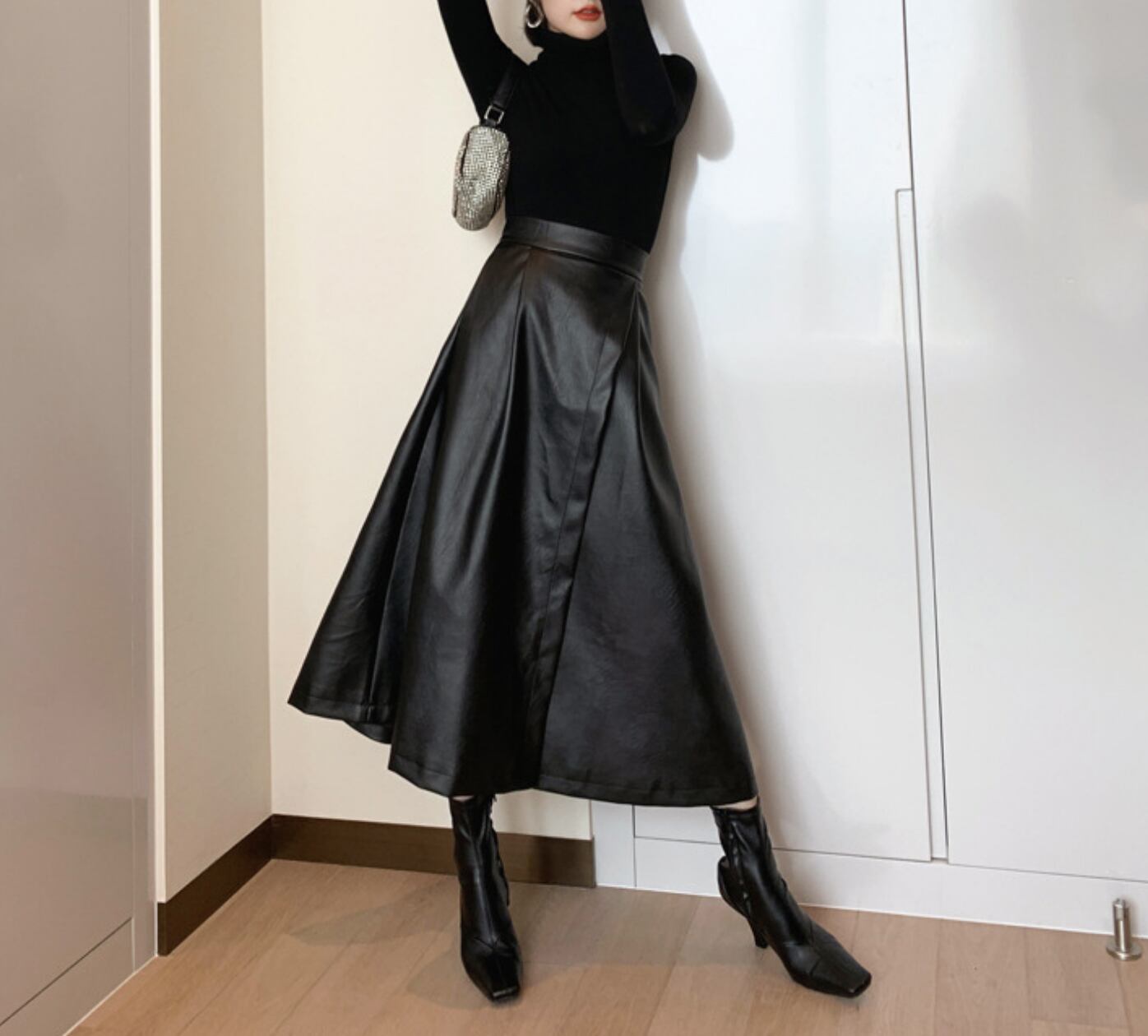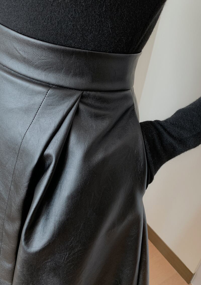 スリットがセクシーなフェイクレザーロングスカート。