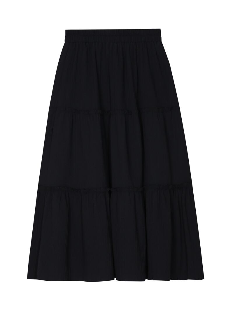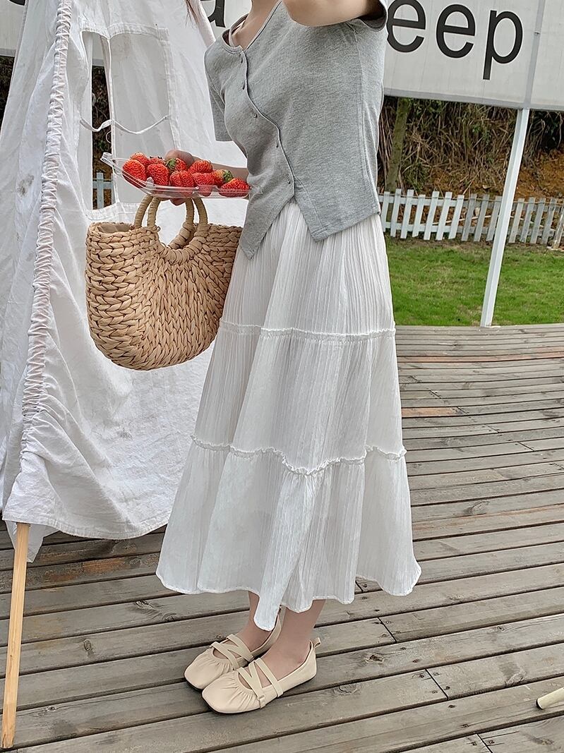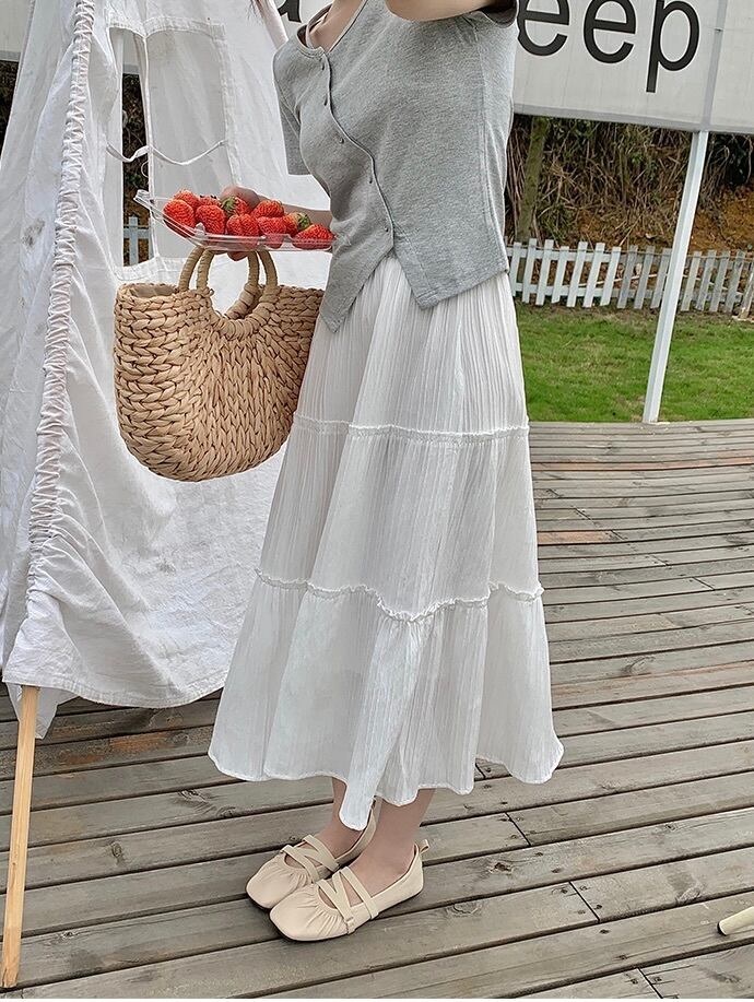 <コメント>2022年夏服として、最適なふんわりスカートのミモレ丈。そして、4段切替もできます。さらに、ウエストはゴム製となっておりますので、安心して心地よく履けます。