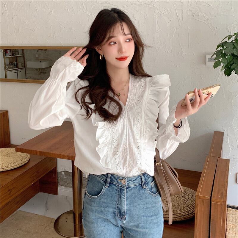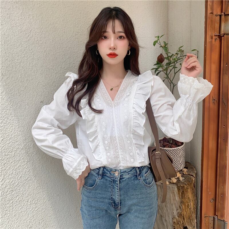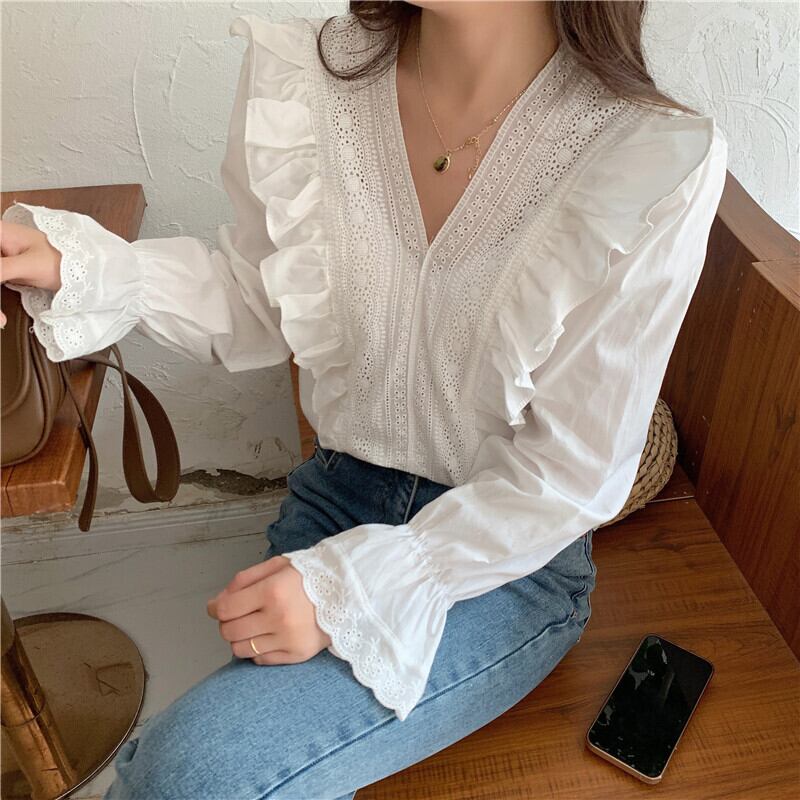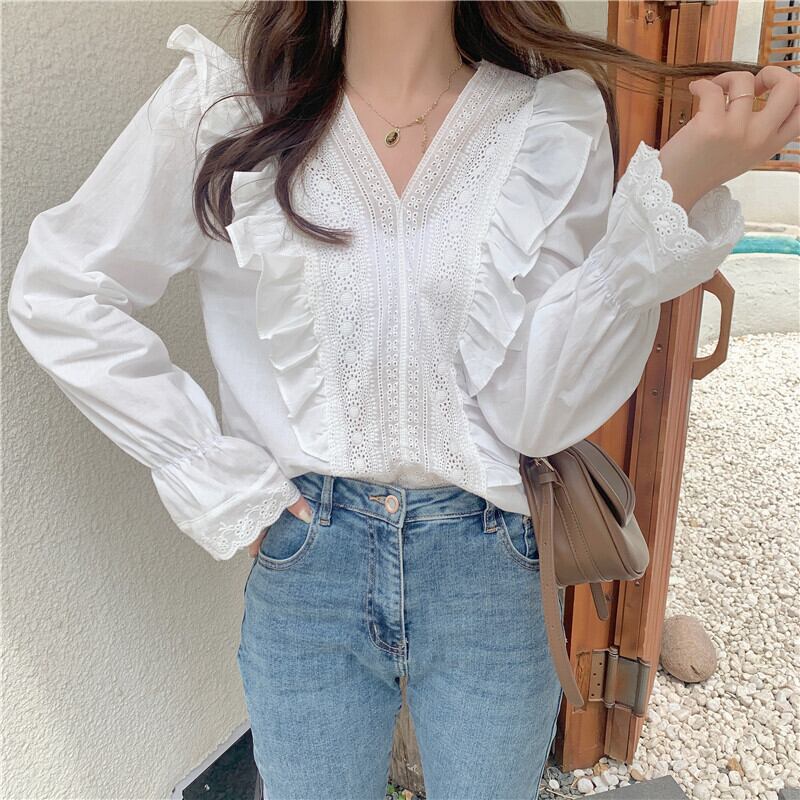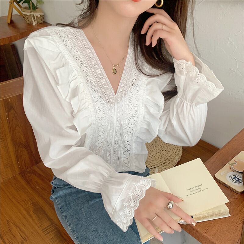 トップス ブラウス 白トップス 袖あり 長袖 ボリューム袖 バブルスリーブ Vネック フレア レース 刺繍 シフォン フリル かわいい 大人可愛い カジュアル 大人 上品 おしゃれ レトロ 大人可愛い 大人女子 ラブリー キュート ガーリー 春 秋 10代 20代 レディース 体系カバー サイズ フリーサイズ 白 ホワイト