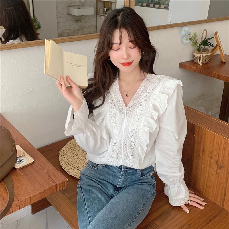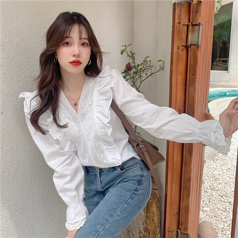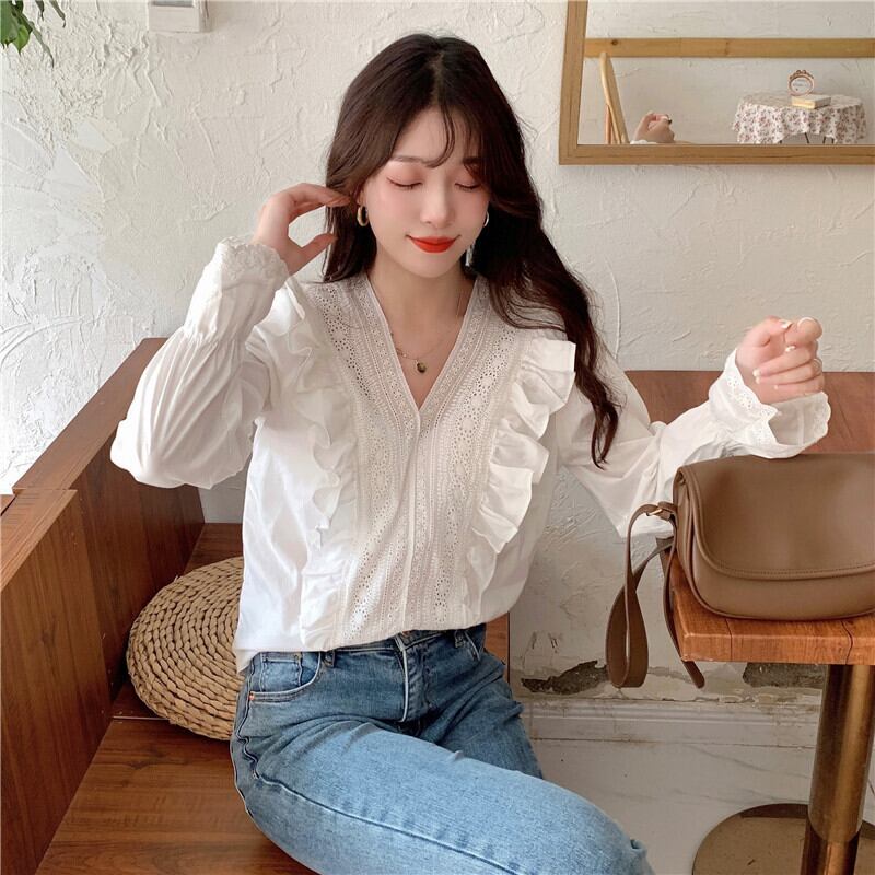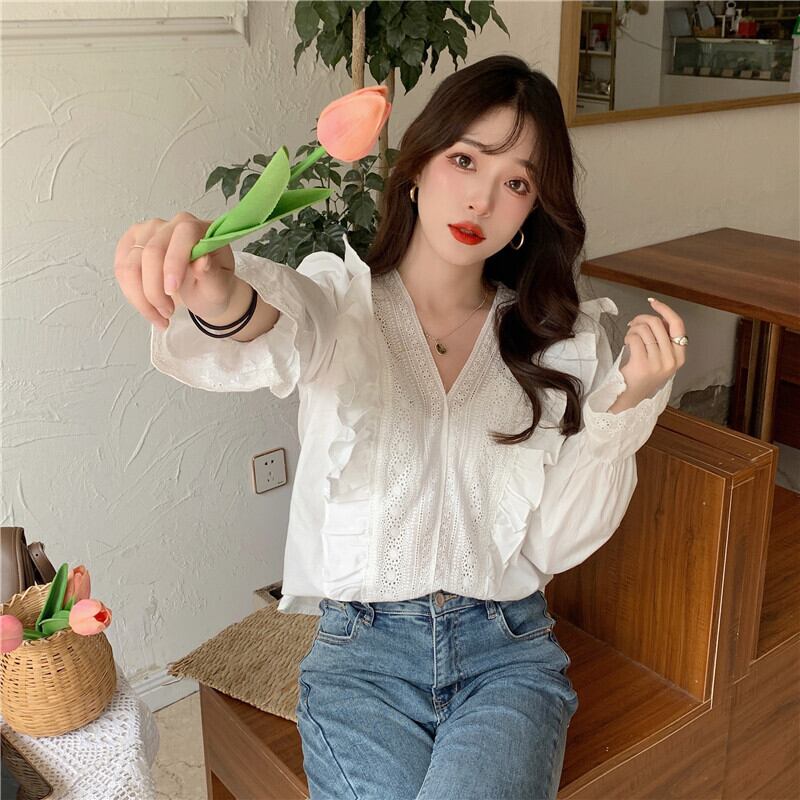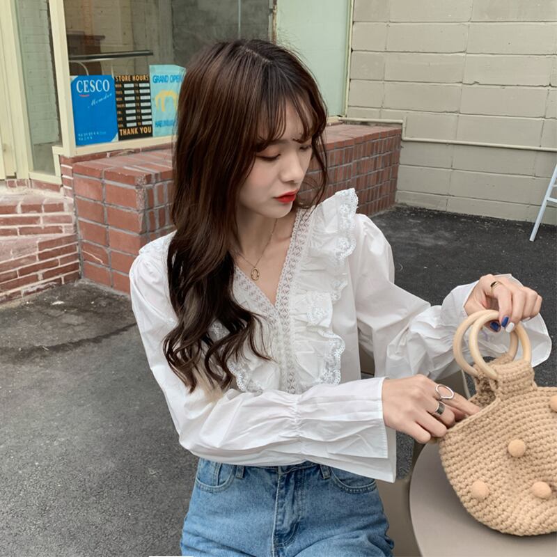 トップス ブラウス 白トップス 袖あり 長袖 ボリューム袖 バブルスリーブ Vネック フレア レース 刺繍 シフォン フリル かわいい 大人可愛い カジュアル 大人 上品 おしゃれ レトロ 大人可愛い 大人女子 ラブリー キュート ガーリー 春 秋 10代 20代 レディース 体系カバー サイズ フリーサイズ 白 ホワイト
