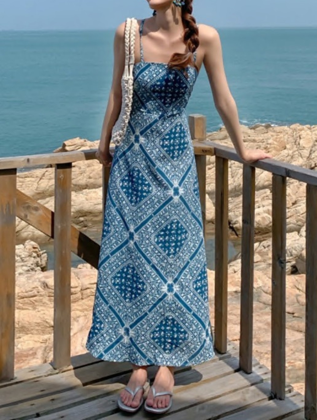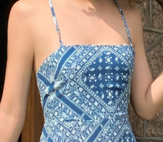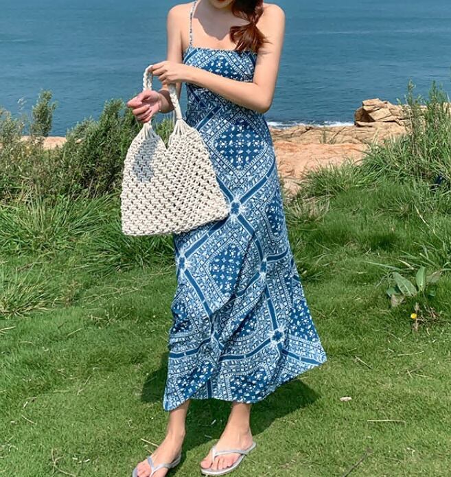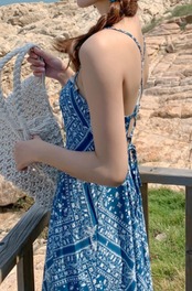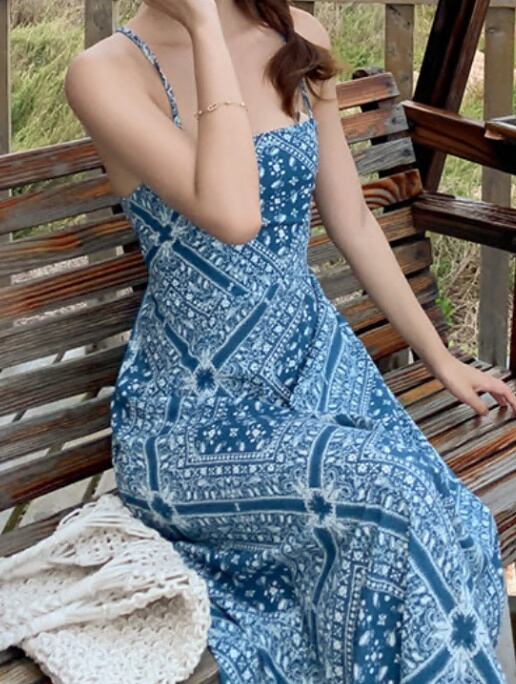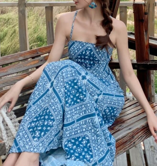 ワンピース ロング丈ワンピ クロスデザイン キャミワンピ 肌見せ 総柄 エスニック調 ワンピ 爽やか 爽やか レトロ 着痩せ トレンド デート服 モテ服 脚長効果 美脚 動きやすい 韓国 かわいい 可愛い リラックス きれいめ 楽ちん 春 スプリング 夏 サマー ストリート カジュアル レディース カジュアル ストリート レトロ 大人可愛い オシャレ オシャレ女子 かわいい フェミニン 飽きのこない 女子 通学 通勤 オフィス セクシー 美脚 10代 20代 30代 ブルー 青