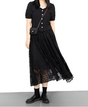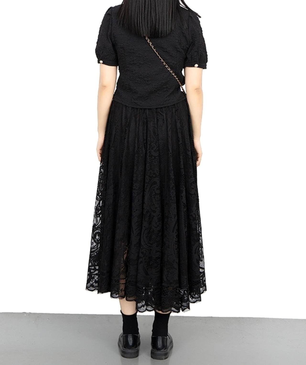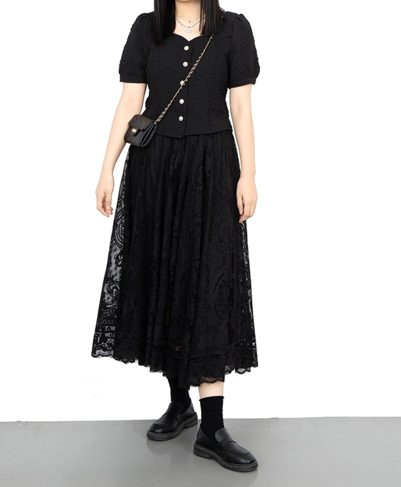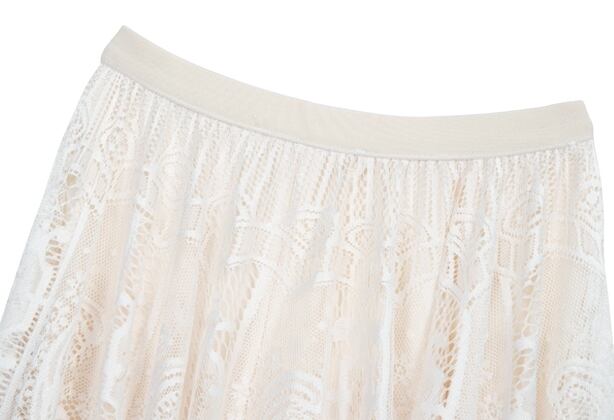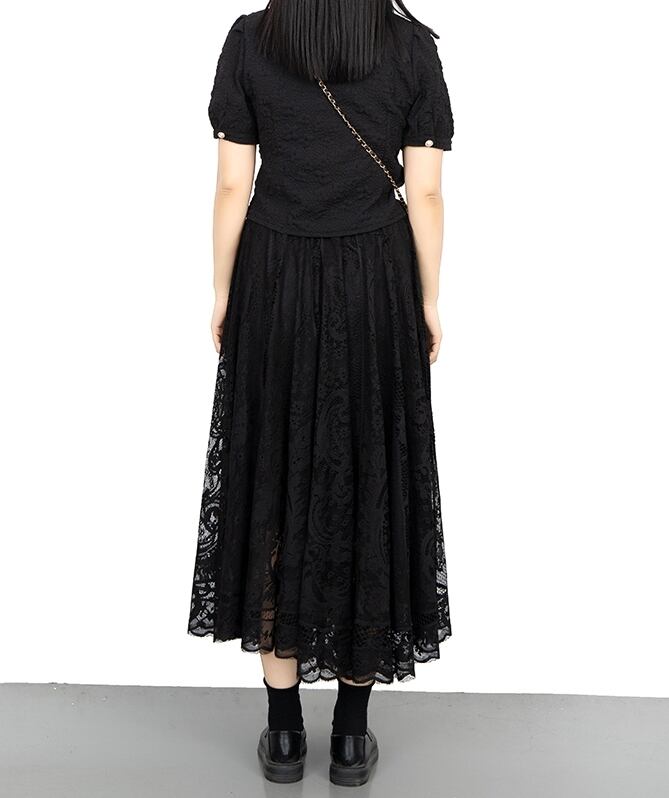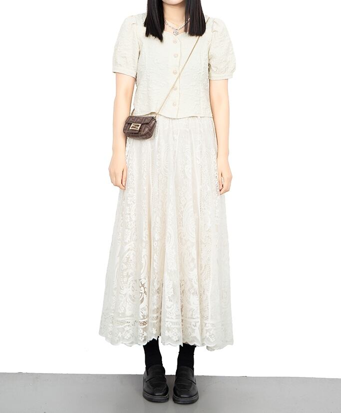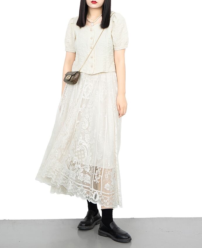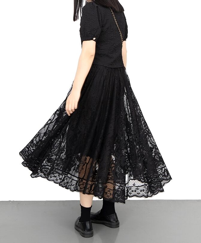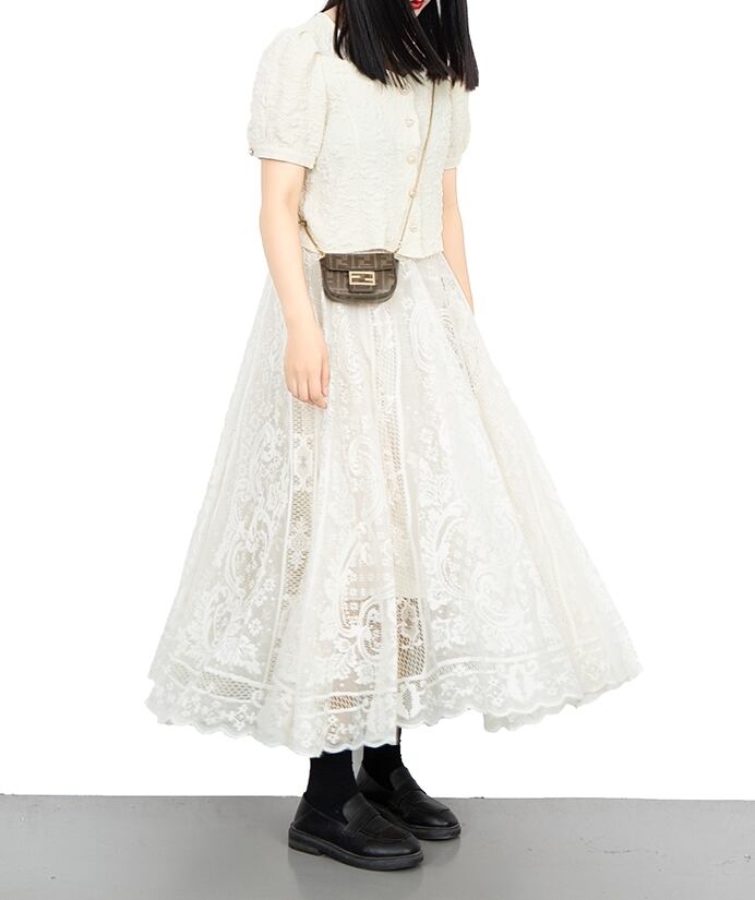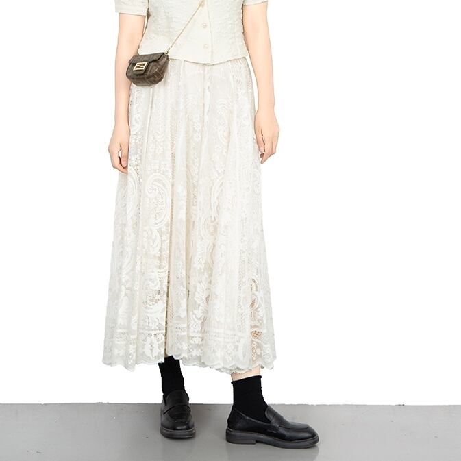 繊細なレースでふんわり仕立てたロングスカートです。