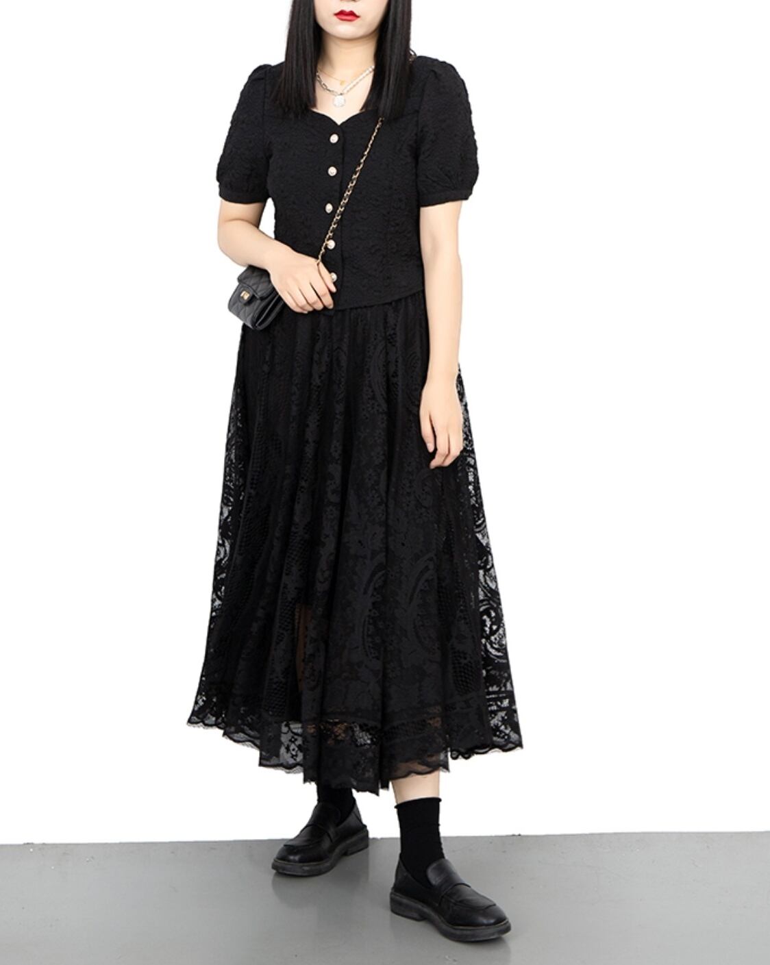 膝下から透け感を活かした短めの裏地付きでさり気なくセクシーです。