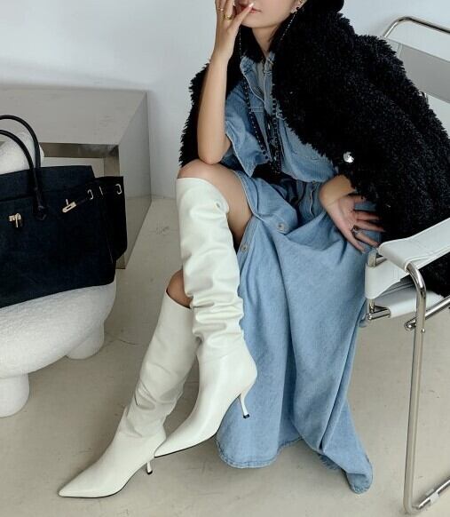 程よいヒールの高さとポインテッドトゥがエレガントに演出できるロングブーツ。