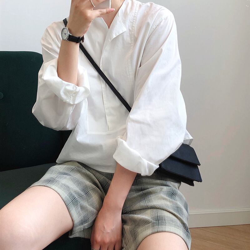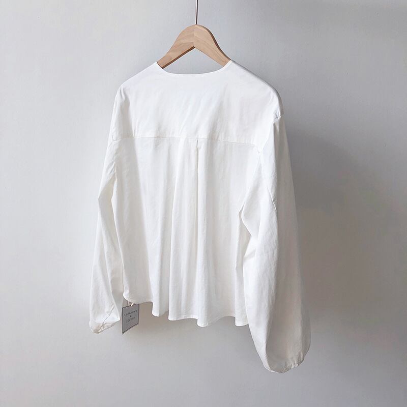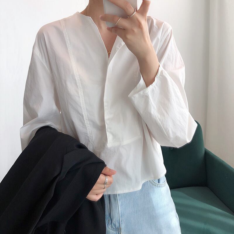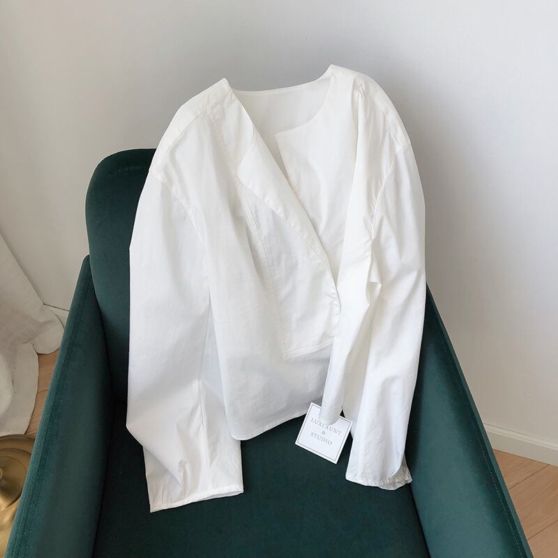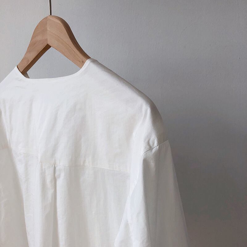 襟のように折り返して可愛いノーカラーデザインシャツ。