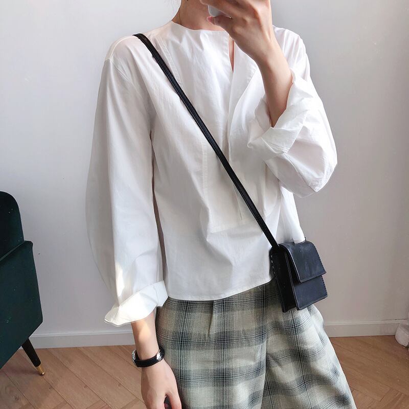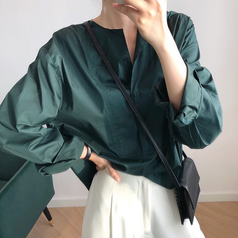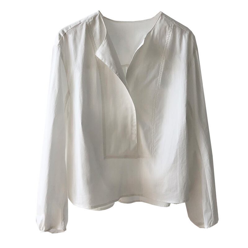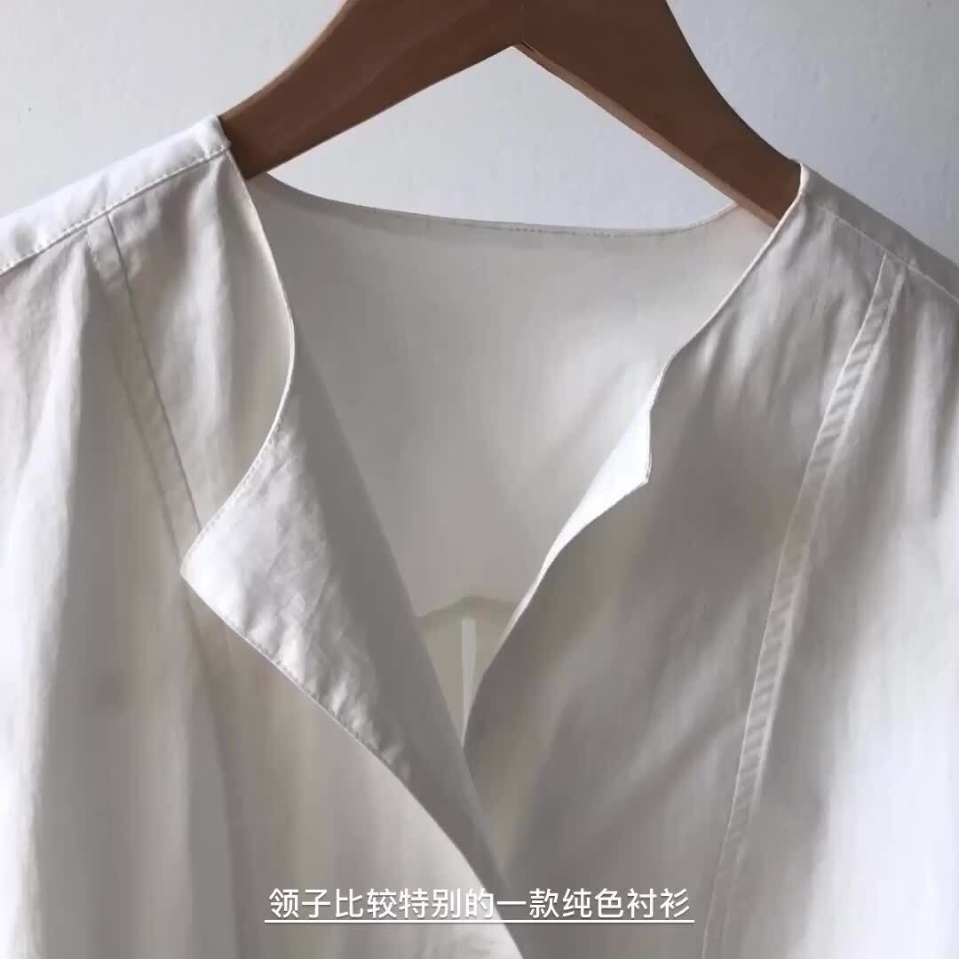 襟のように折り返して可愛いノーカラーデザインシャツ。