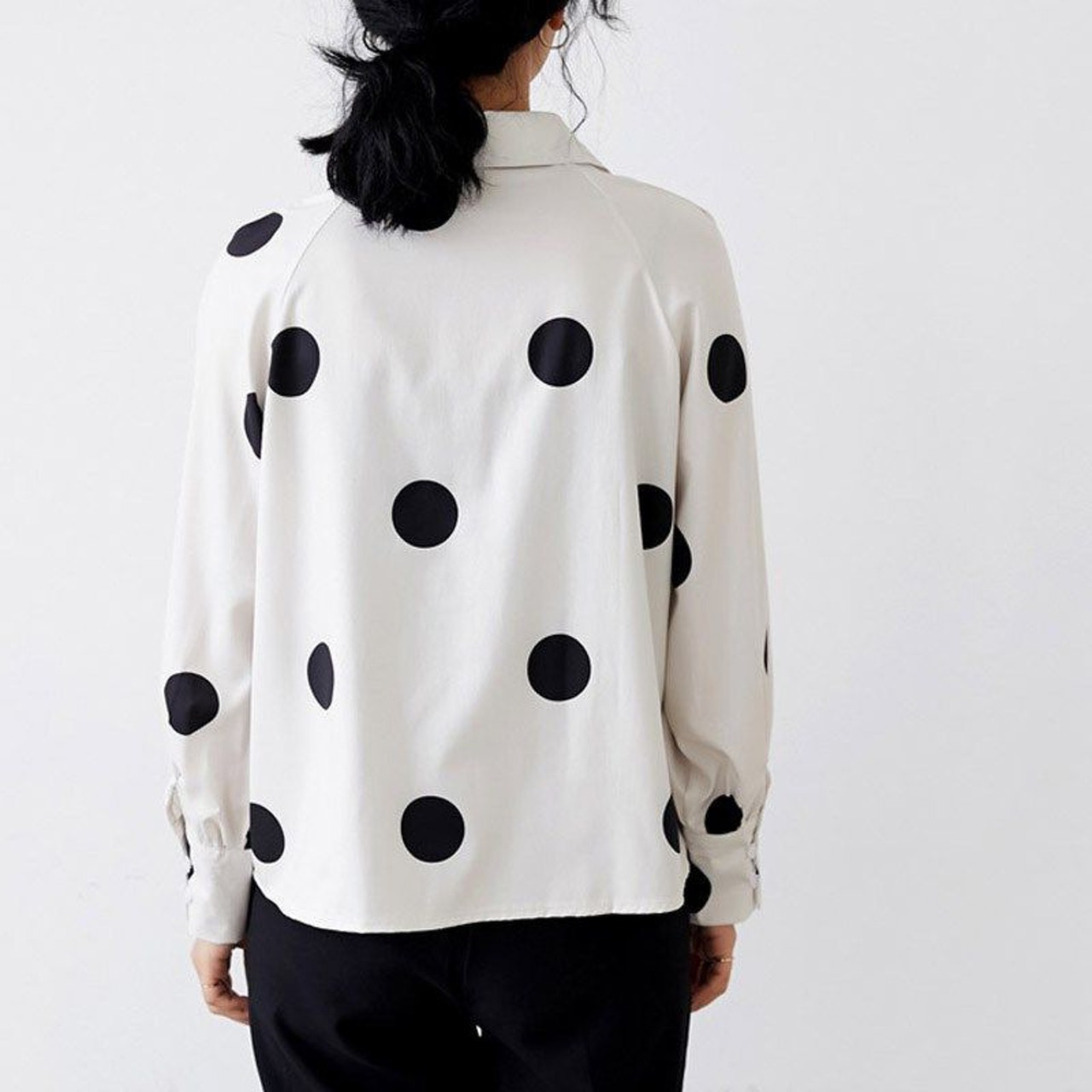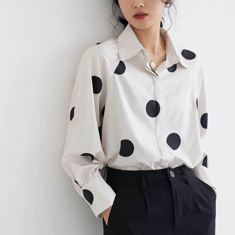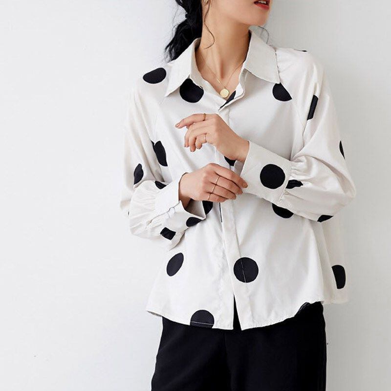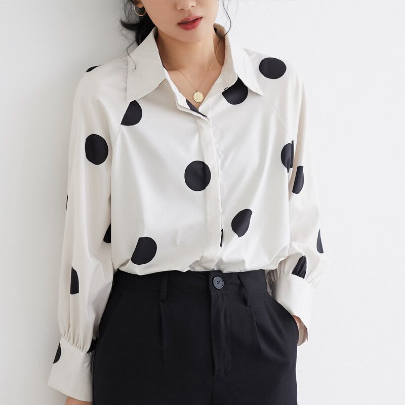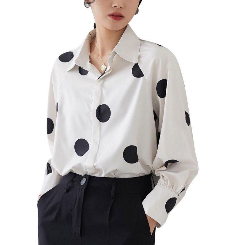 ブラウス 長袖 ロング 柄 ドット ポリエステル 韓国 かっこいい カジュアル 大人 上品 きれいめ シンプル サマー 夏 ストリート 事務服 春 レディース 女性用 20代 30代 S M L XL 2XL ゆったり ゆる 白 ホワイト 大人カラー 水玉