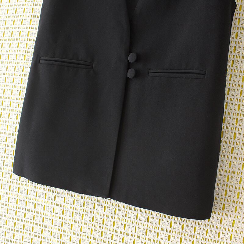 フロントの共布くるみボタンがクラシカルな印象のノーカラージレ。