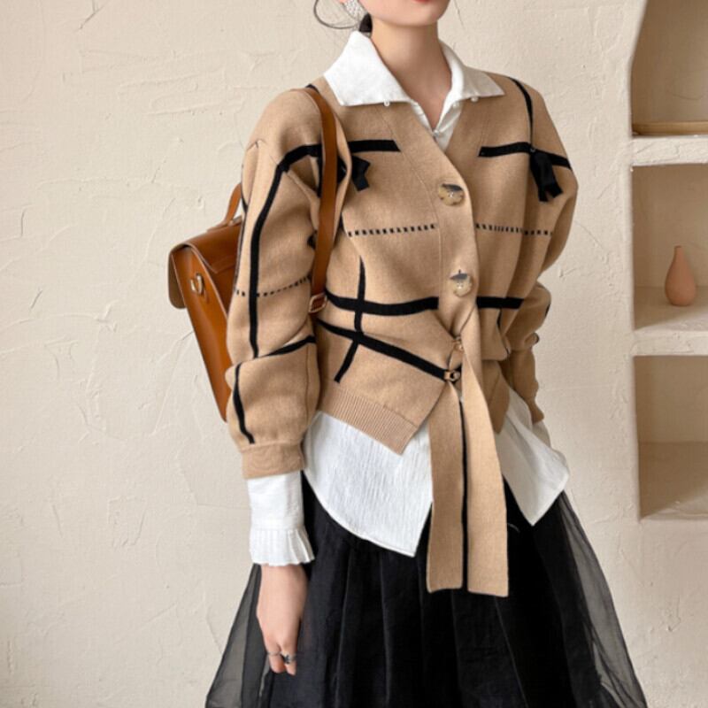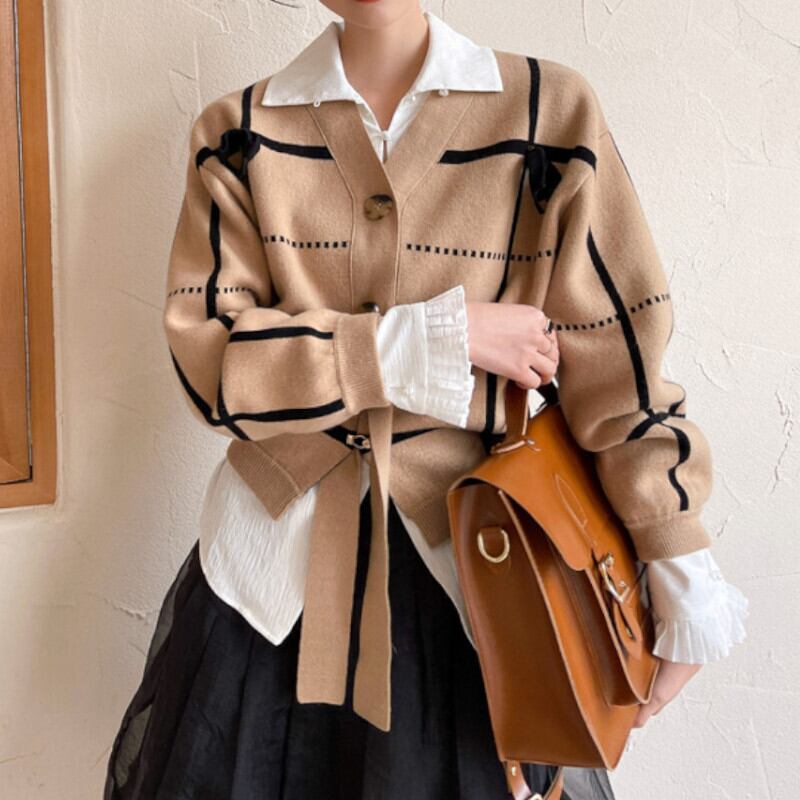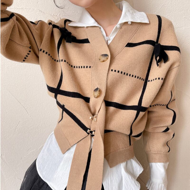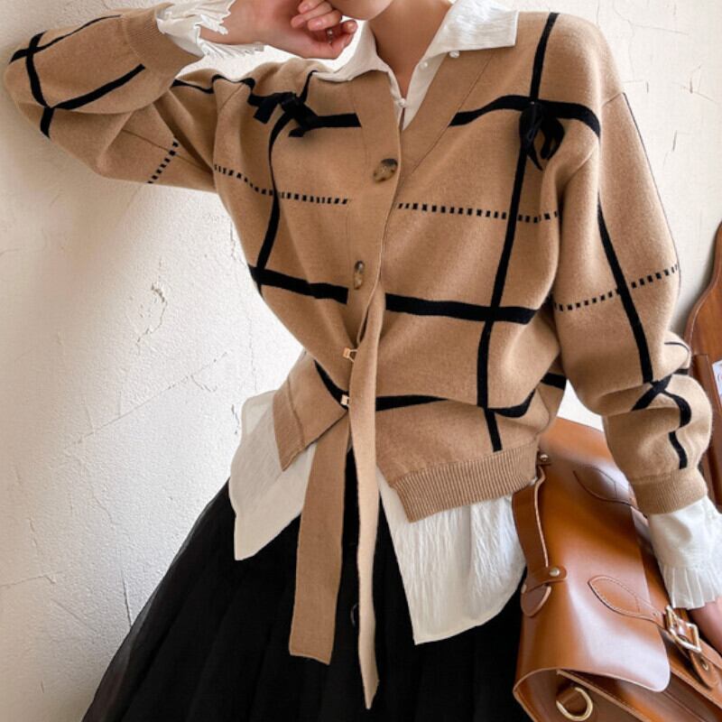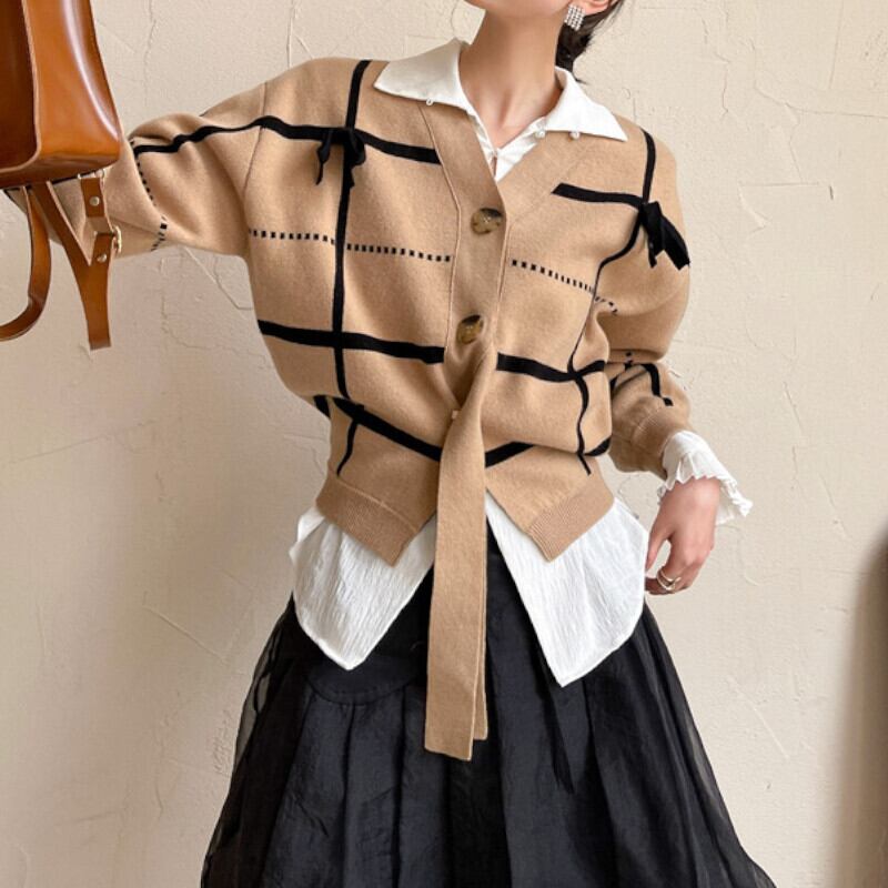 トップス セーター カーディガン 袖あり 長袖 ラウンドネック Aライン リボン かわいい 大人可愛い きれいめ シンプル カジュアル 大人 上品 おしゃれ レトロ キュート とろみ感 チェック柄 春 秋 冬 10代 20代 30代 40代 レディース 通勤 学生 通学 デート お出かけ 女子会 休日 リゾート 旅行 着回し 普段使い 韓国系 オルチャン ファッション コーデ スタイル モテ 体型カバー 定番 トレンド XS S M ベージュ