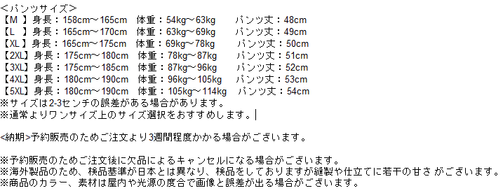 【5XL】身長:180cm〜190cm 体重:105kg〜114kg パンツ丈:54cm