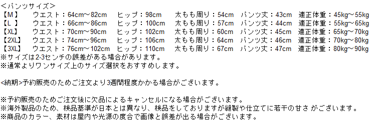 【M】ウエスト:64cm〜82cm ヒップ:98cm 太もも周り:54cm パンツ丈:43cm 適正体重:45kg〜55kg