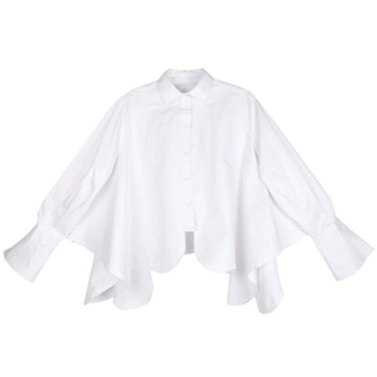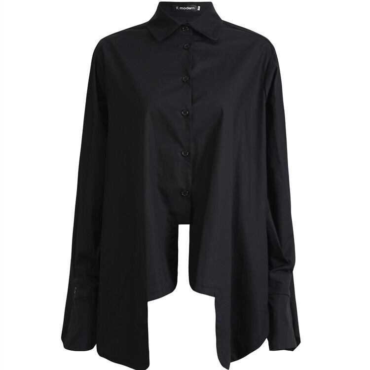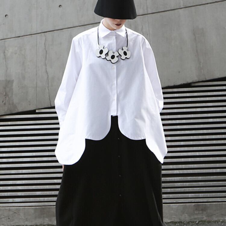 大胆にラウンドカットされたアシメシルエットのシャツです。
