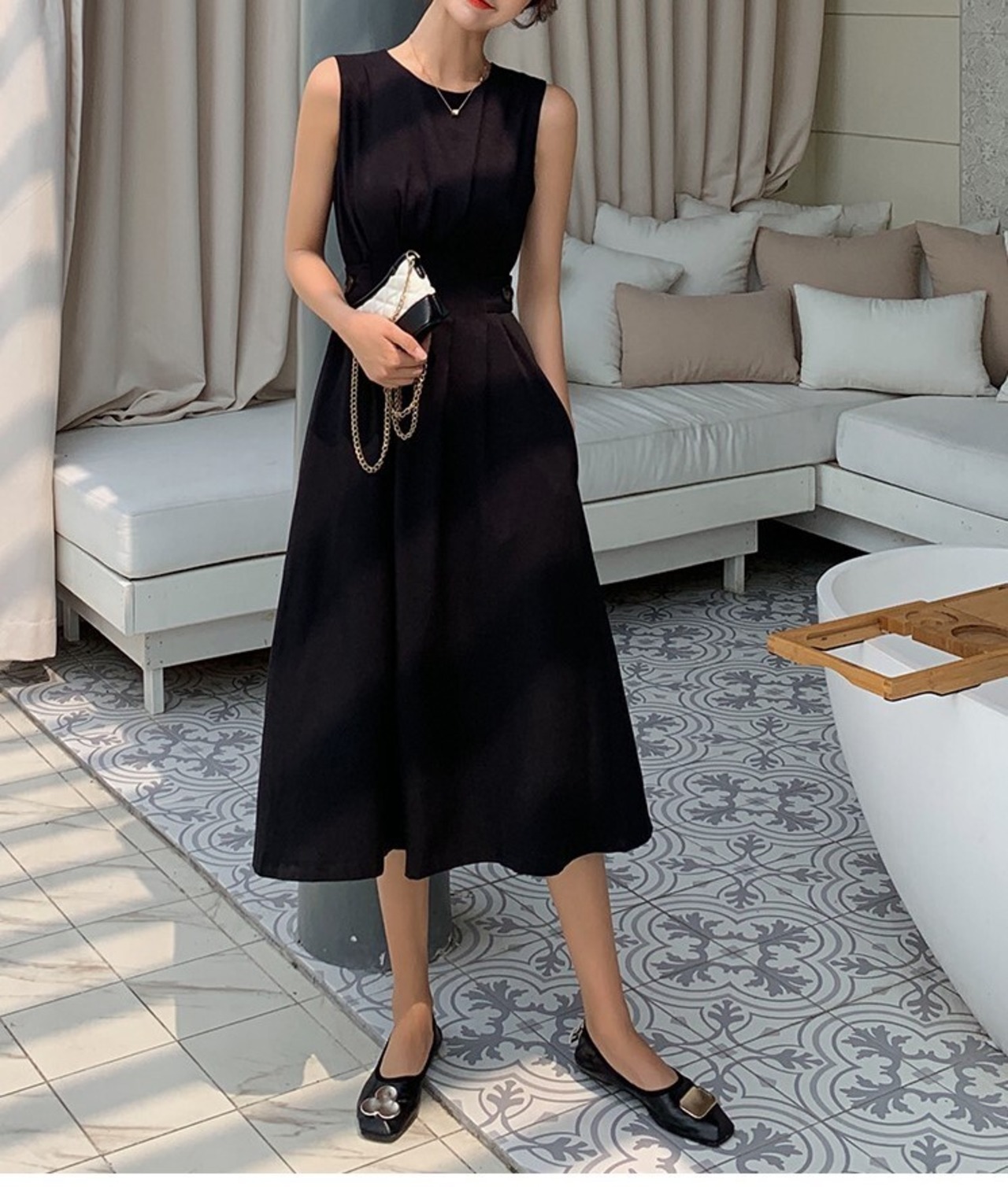 ウエストの後ろ部分がボタンで絞ってご着用頂けるデザインのノースリーブワンピース♪