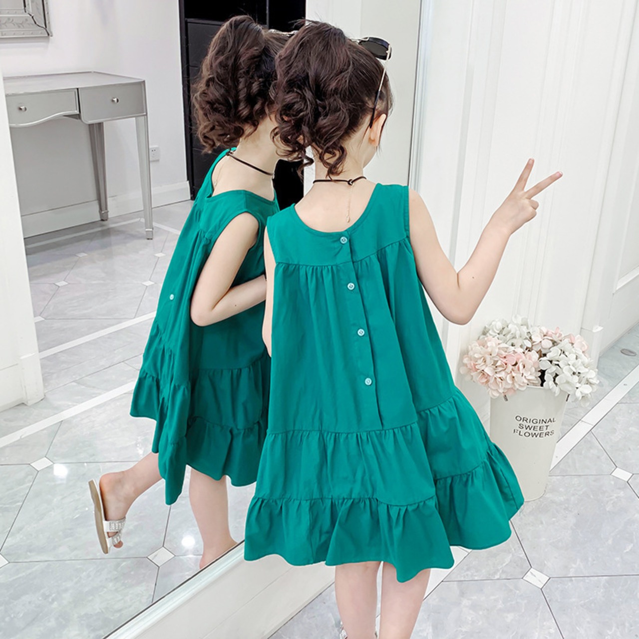子ども服 トップス ワンピース 白トップス 袖なし ノースリーブ フレア フリル かわいい おしゃれ 夏 ママ お出かけ 休日 着回し 普段使い 韓国 楽ちん サイズ 90 100 110 120 130 140 150 ホワイト グリーン オフホワイト