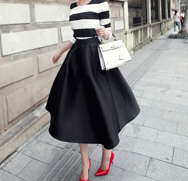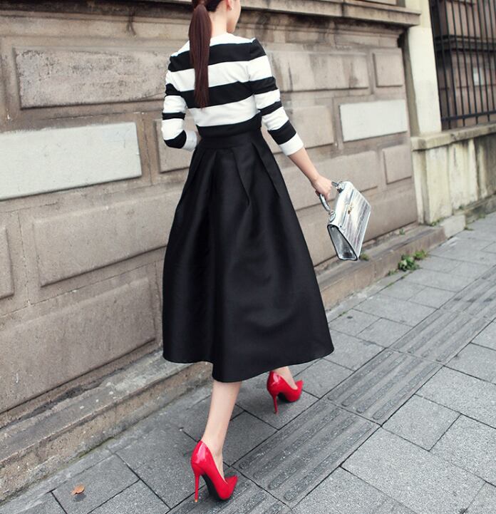 高い位置でウエストをしっかりマークするAラインスカートは体型カバーしつつ、ハイウエストの脚長スタイルを作ります。