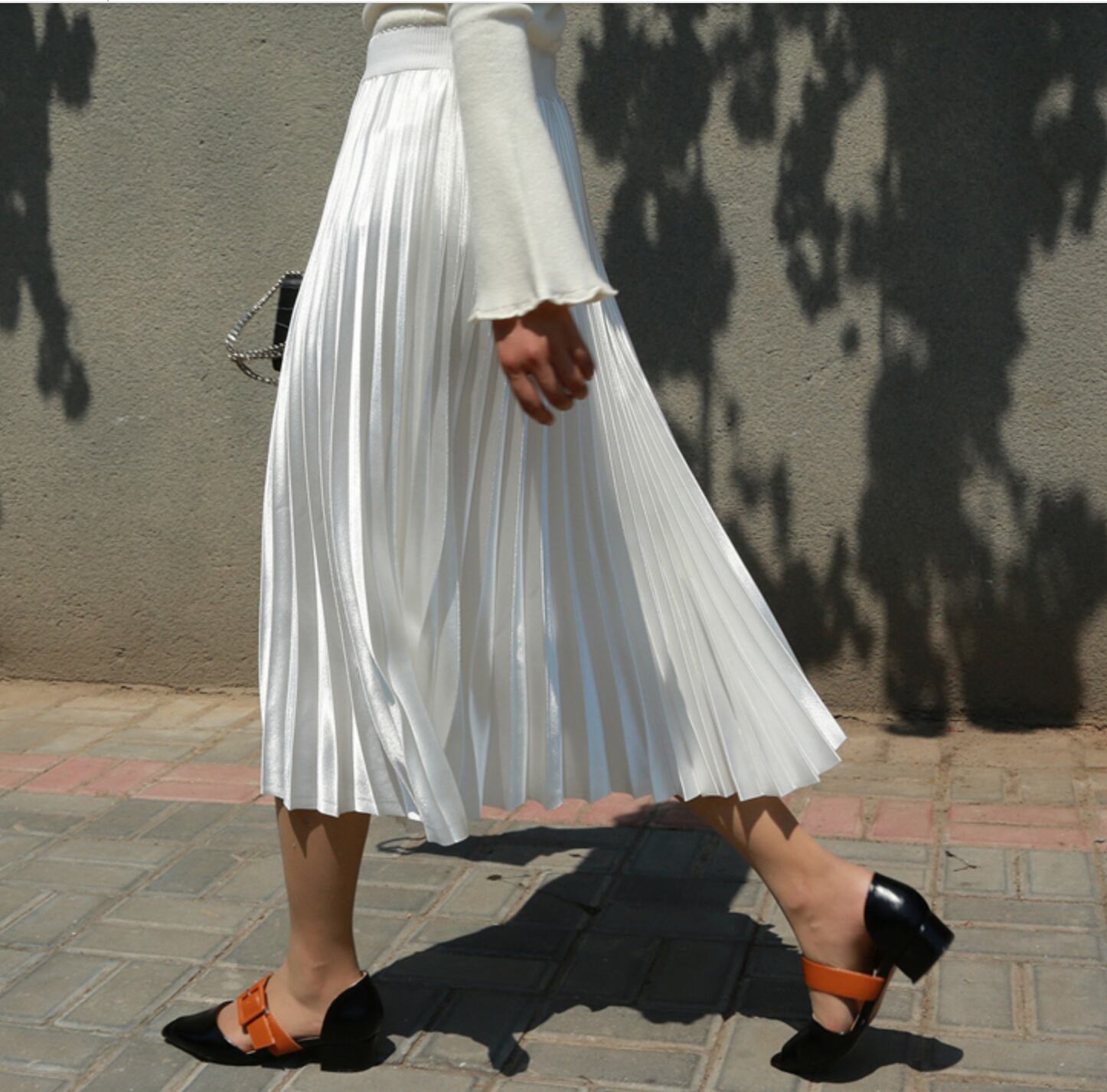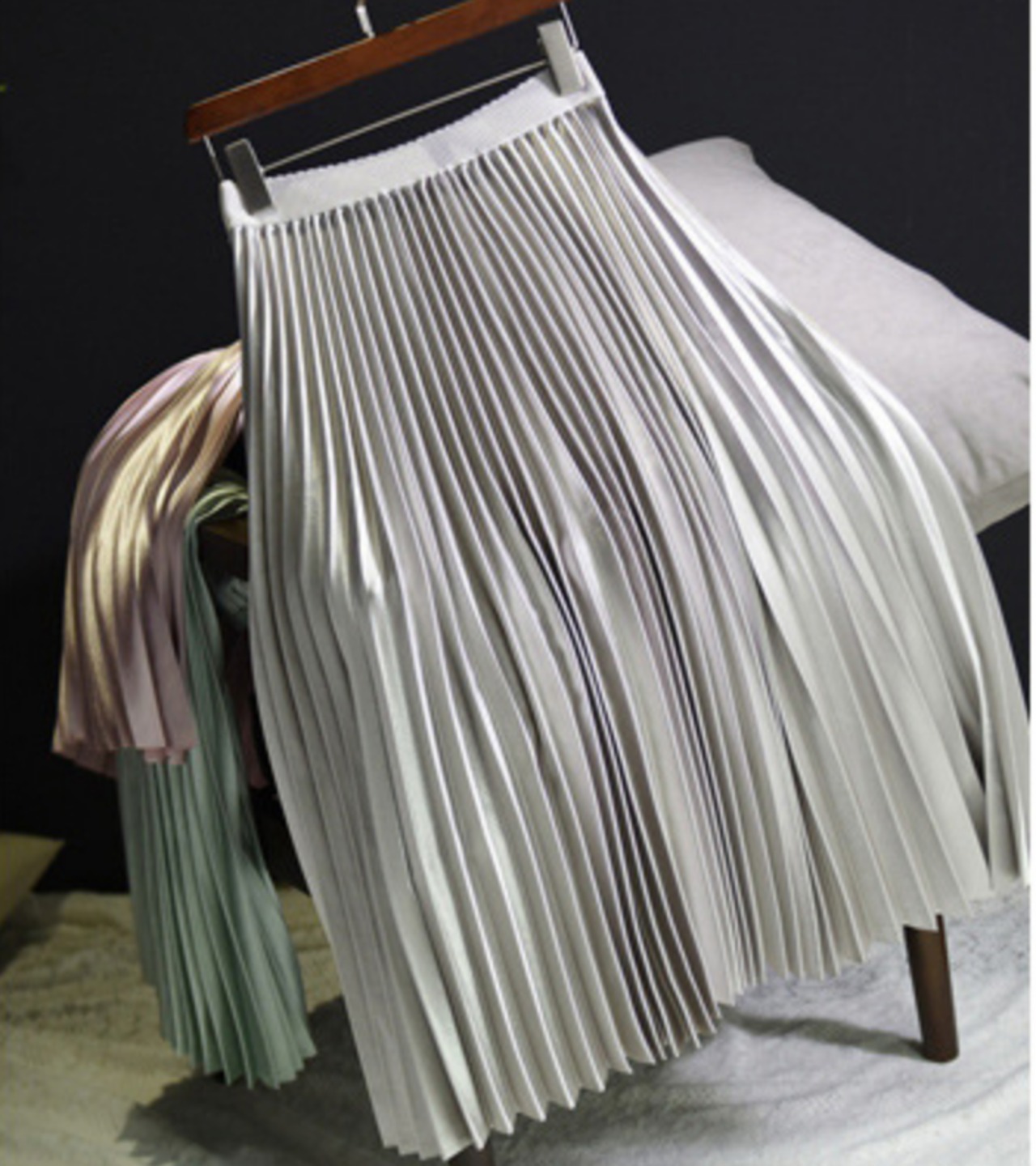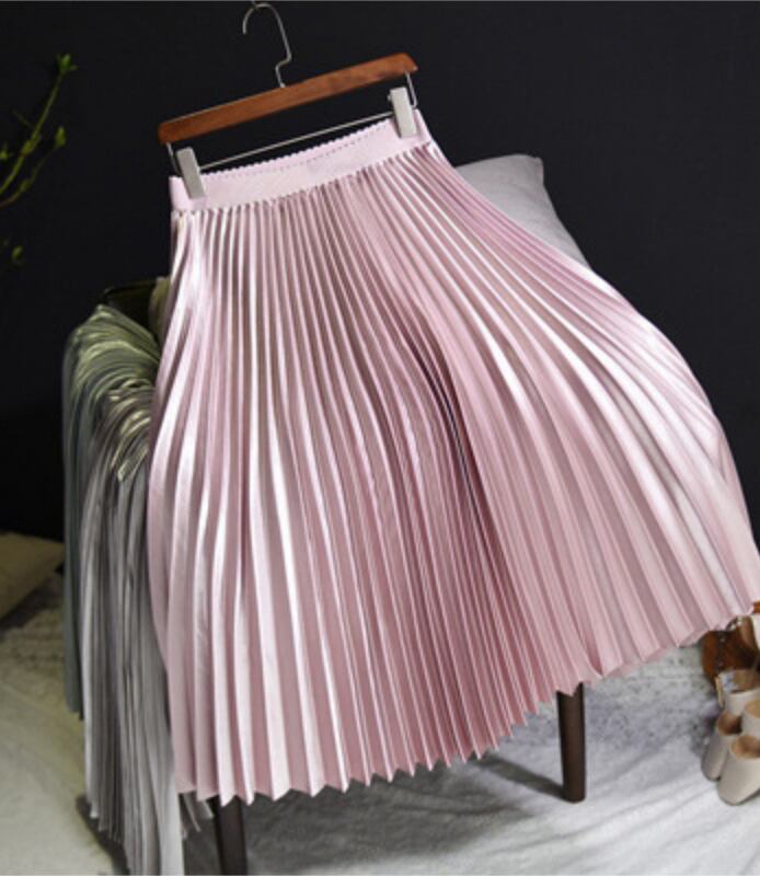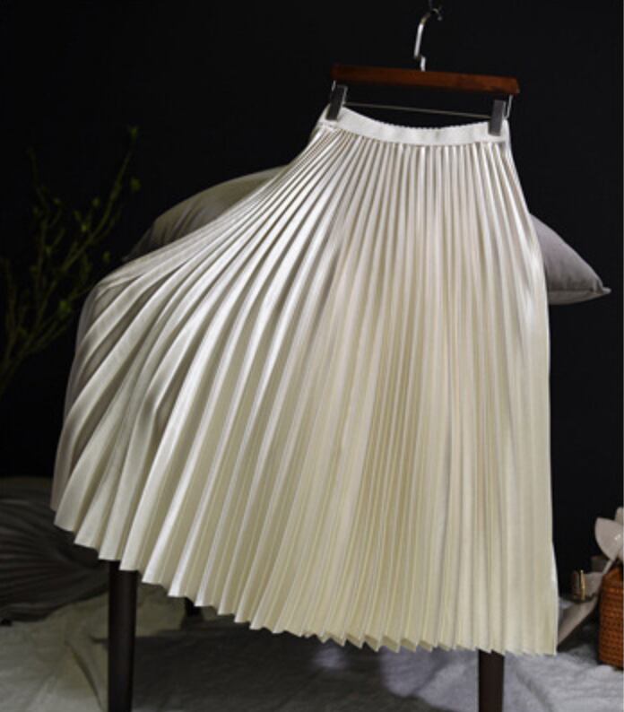 サテン風生地の綺麗めロングプリーツスカート。