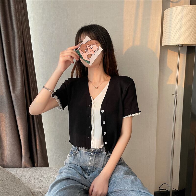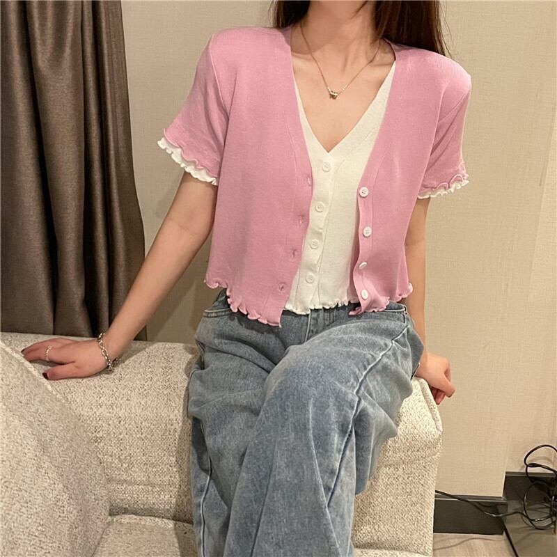 トップス カーディガン ショート丈 袖あり 半袖 フリル 2点セット かわいい きれいめ シンプル おしゃれ 無地 春 夏 10代 20代 30代 ママ 学生 通学 デート お出かけ 休日 着回し 普段使い 重ね着 韓国 楽ちん XL 2XL 3XL 4XL サイズ ブラック ベージュ ピンク 水色