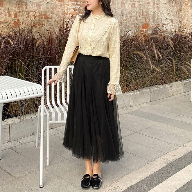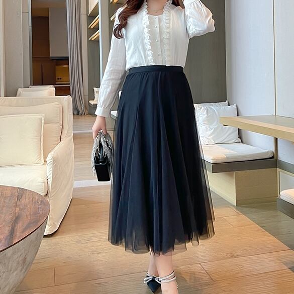 ふわっと広がるデザインが女性らしいミモレ丈チュールスカートです。