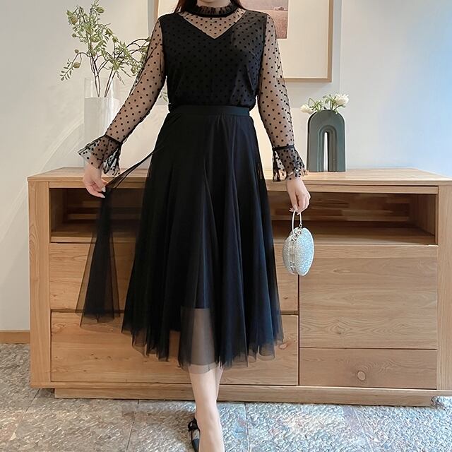 ミディアム丈の裏地付きで膝下の透け感が上品なデザインです。
