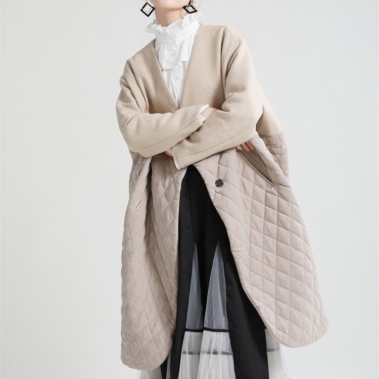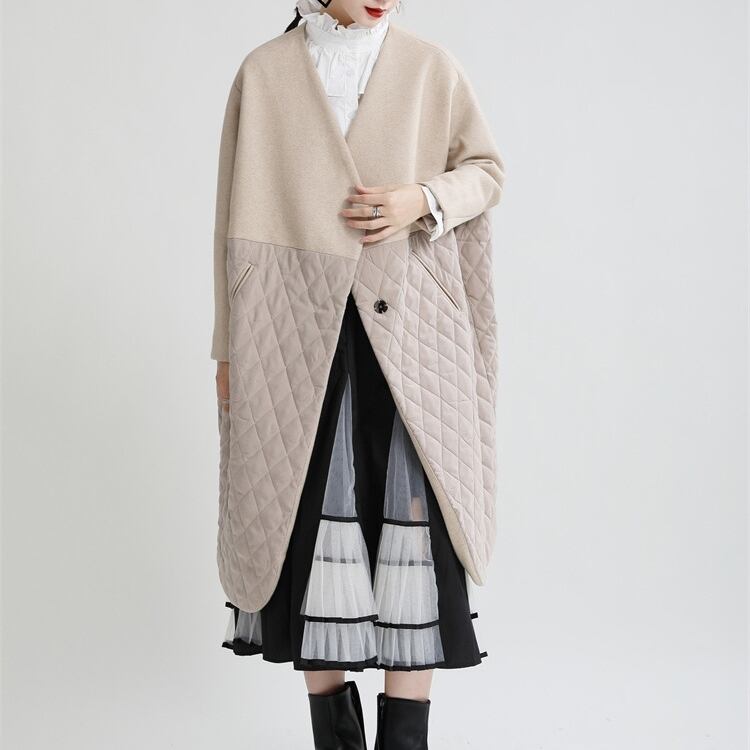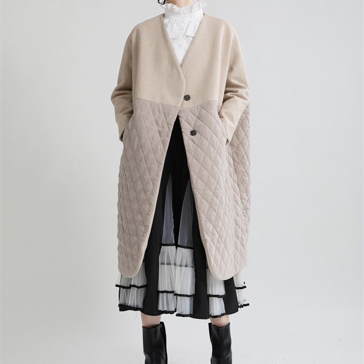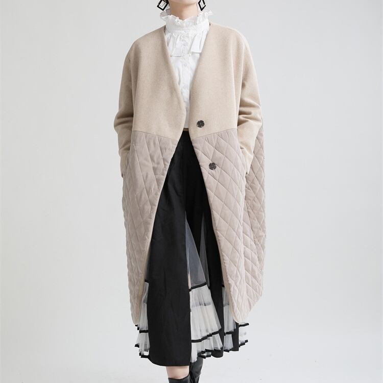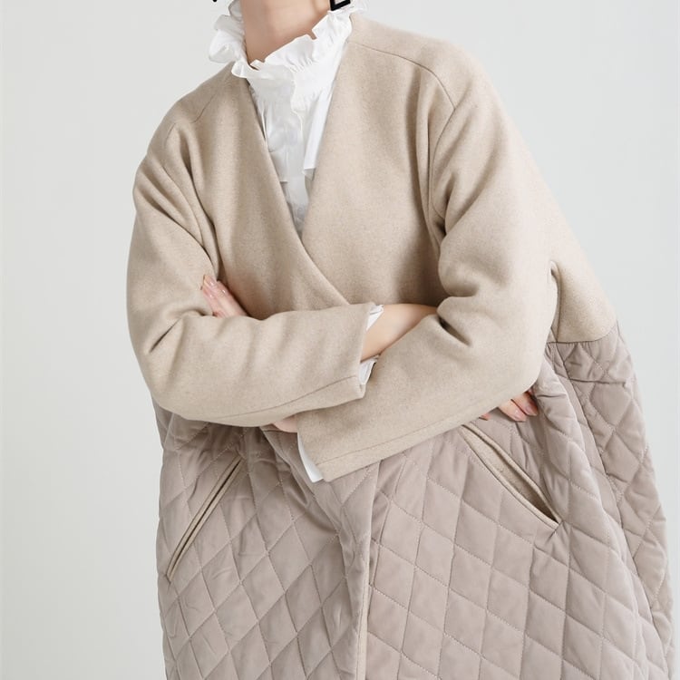 中綿コート レディース アウター ダウンコート 切り替え フェルト 起毛 ノーカラー キルティング 薄手 韓国風 幾何学模様 ロング丈 軽い 軽量 冬服 厚手 アウター 暖かい 大きいサイズ スリム 防寒 10代 20代 30代 40代 レディース オフィス OL 通勤 学生 通学 デート お出かけ 女子会 リゾート 旅行 着回し 普段使い 韓国系 オルチャン ファッション コーデ スタイル モテ 体型カバー M L XL 2XL ベージュ カーキ ブルー ブラック