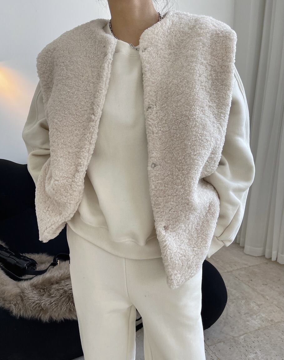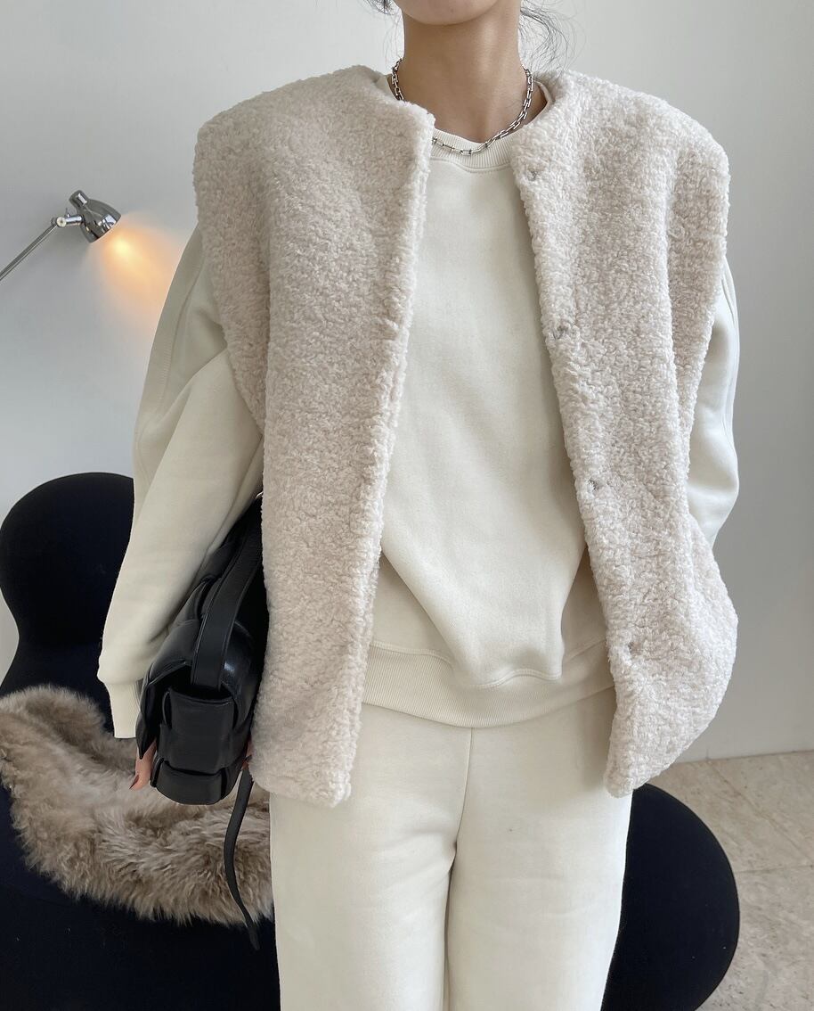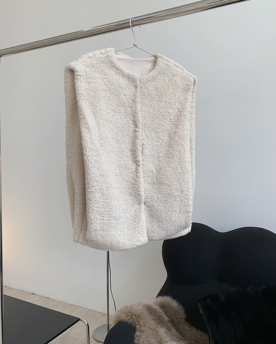 ヒツジのようなもこもこ生地のノーカラーベストです。