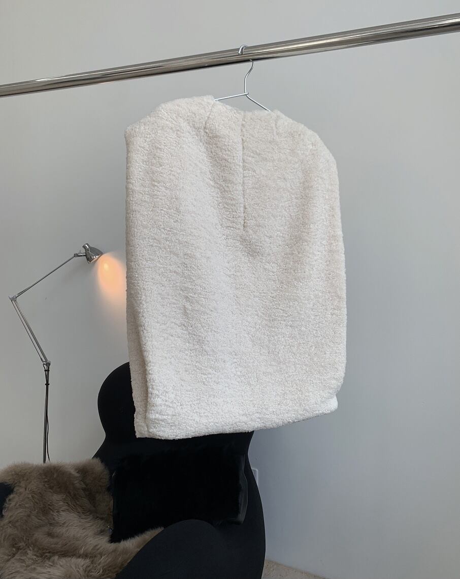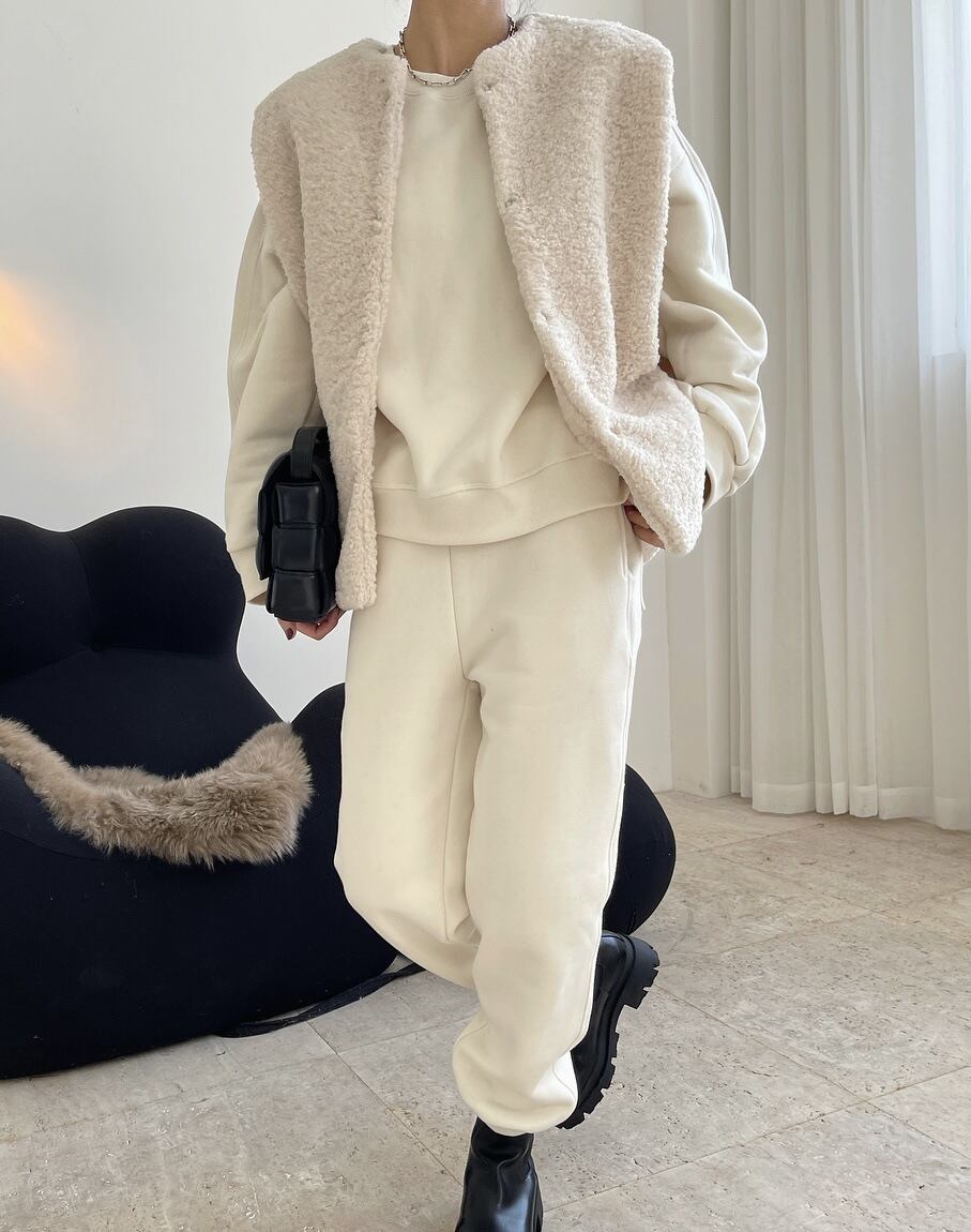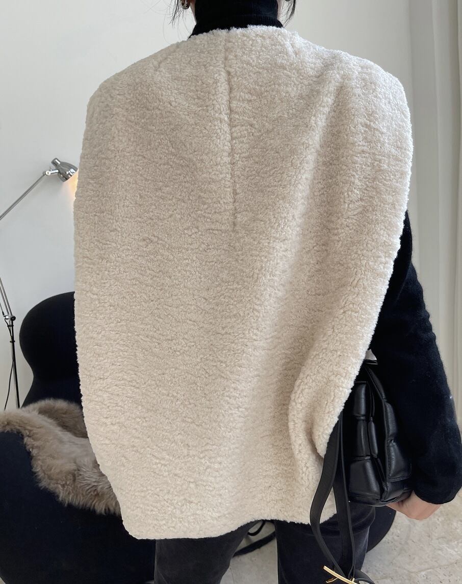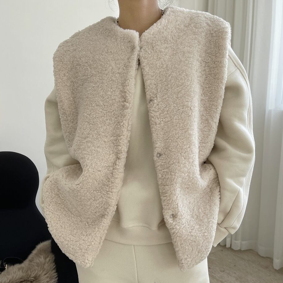 ヒツジのようなもこもこ生地のノーカラーベストです。