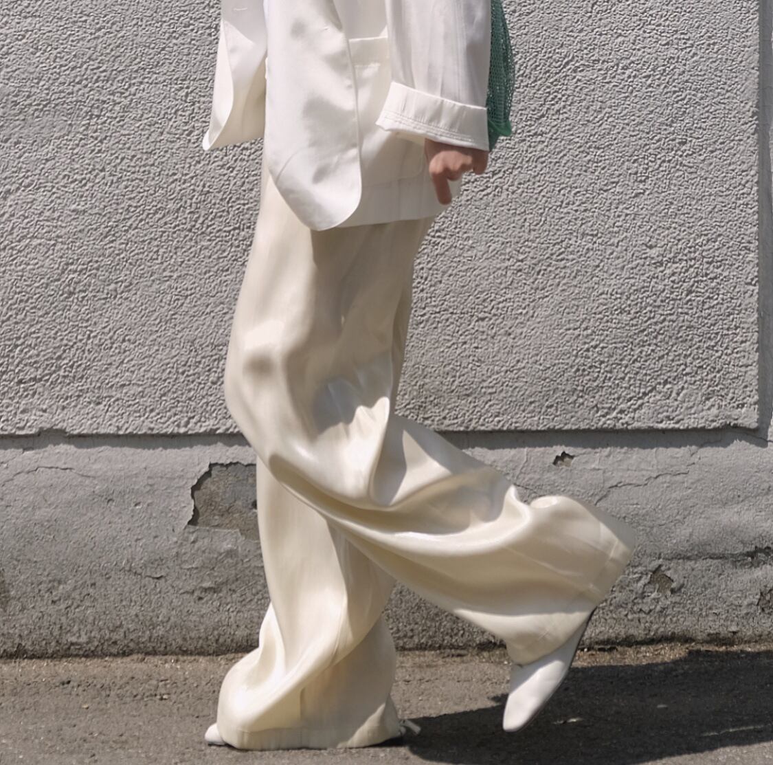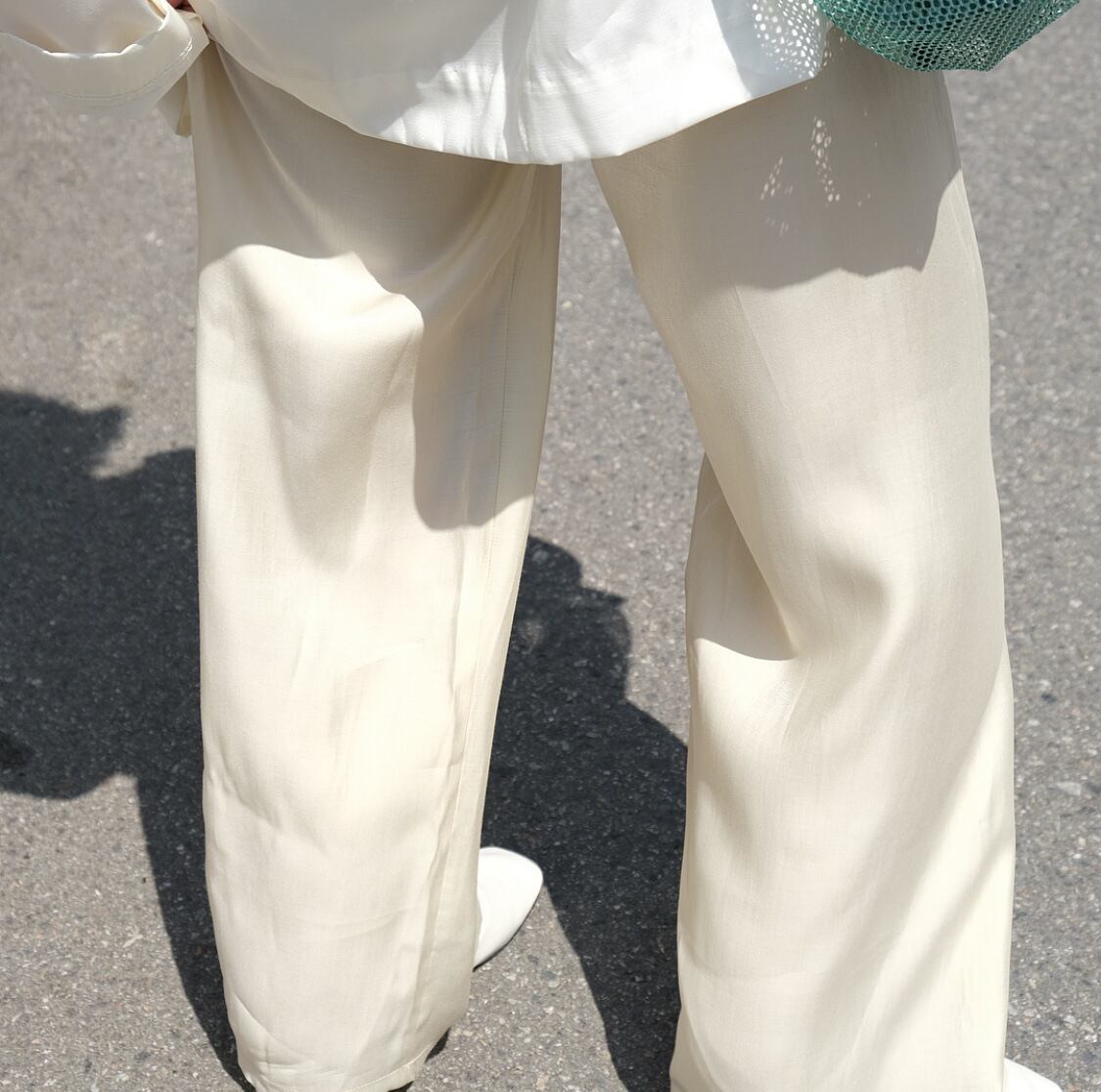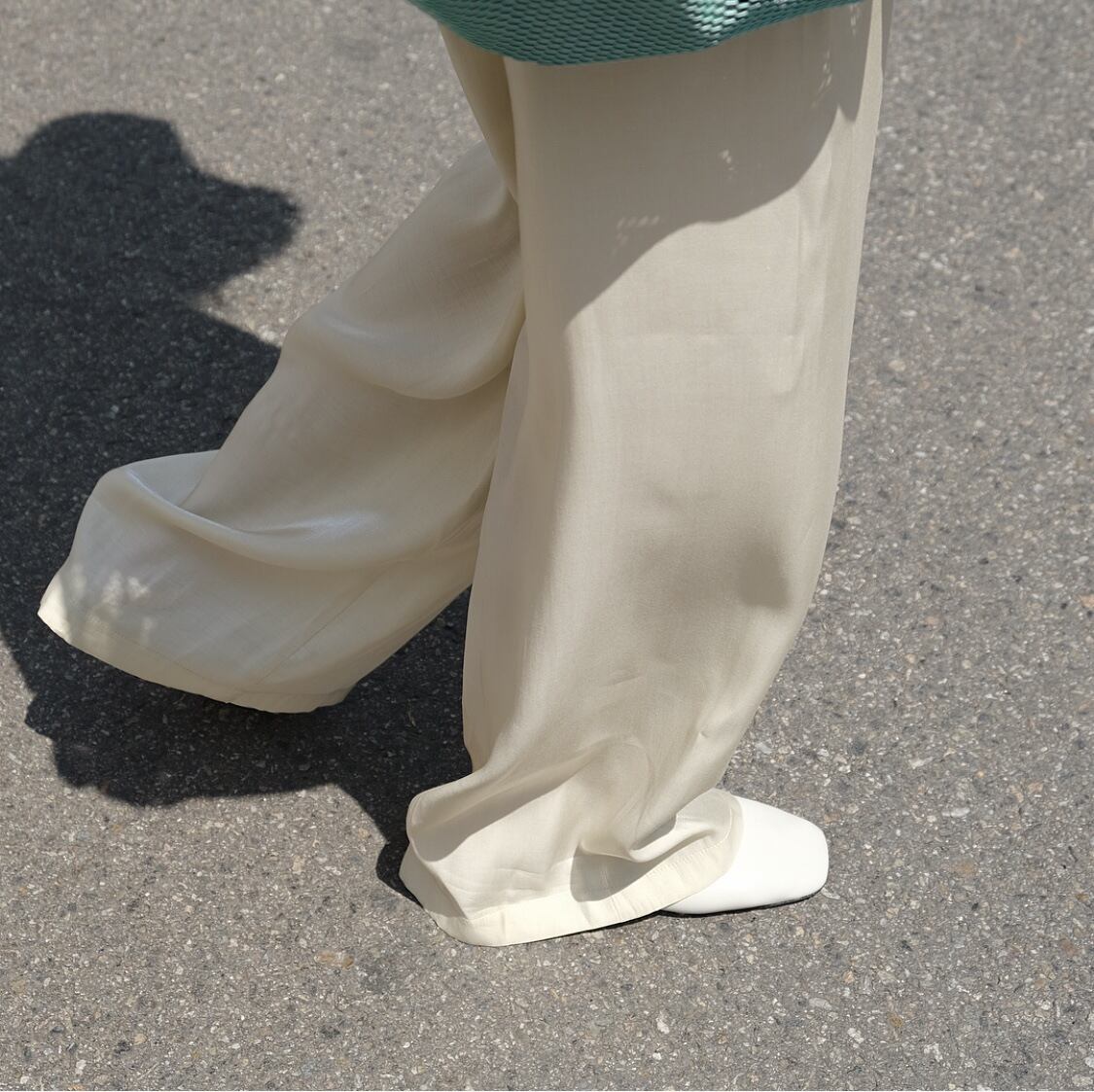 サテン風のツヤツヤの生地が可愛いワイドパンツ。
